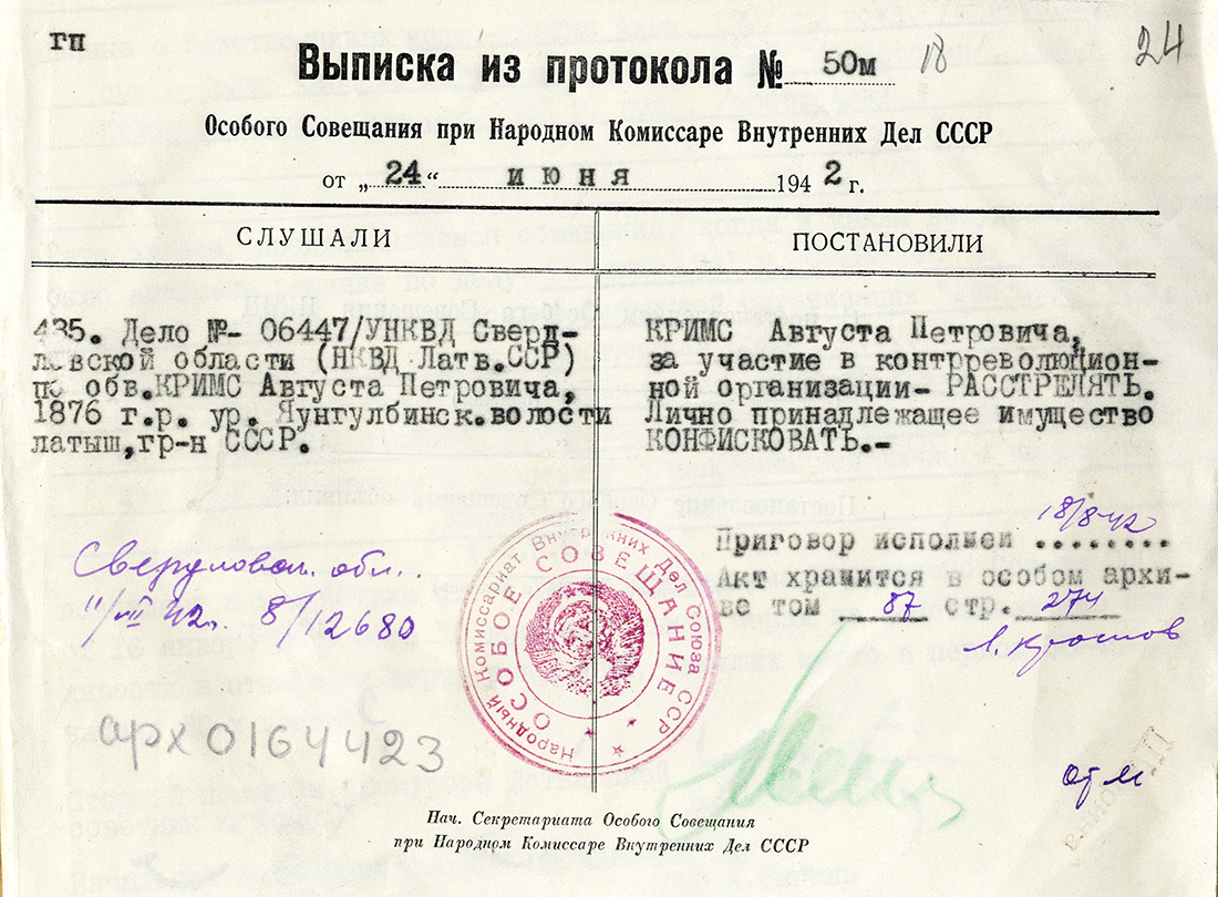 Pētera Krima ģimenePēteris Krims Augusta d., dz. 1927, dzīvoja Abrenes apriņķa Tilžas pagastā, izsūtīts 14.06.1941 uz Krasnojarskas novada Berjozovskas raj., atbrīvots 29.11.1956. LVA, 1987. f., 1. apr. (Abrene), 15605. l. Tēvs Krims Augusts Pētera d., dz.1876, dzīvoja Abrenes apriņķa Tilžas pagastā, 14.06.1941 nosūtīts uz Sverdlovskas apgabalu Sevurallags, nošauts 18.08.1942. LVA, 1987. f., 1. apr. (Abrene), 15605. l.; LVA, 1986. f., 2. apr., P-6677. l. Māte Krima Alma Indriķa m., dz.1908, dzīvoja Abrenes apriņķa Tilžas pagastā, izsūtīta 14.06.1941 uz Krasnojarskas novada Berjozovskas raj., atbrīvota 29.11.1956. LVA, 1987. f., 1. apr. (Abrene), 15605. l. Brālis Krims Ilgonis Augusta d., dz. 1933, dzīvoja Abrenes apriņķa Tilžas pagastā, izsūtīts 14.06.1941. uz Krasnojarskas novada Berjozovskas raj., atbrīvots 29.11.1956. LVA, 1987. f., 1. apr. (Abrene), 15605. l. |