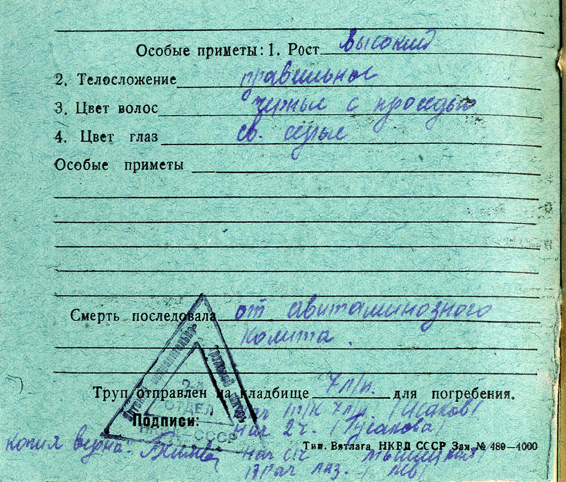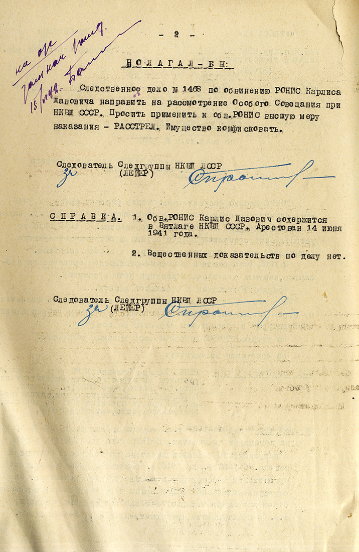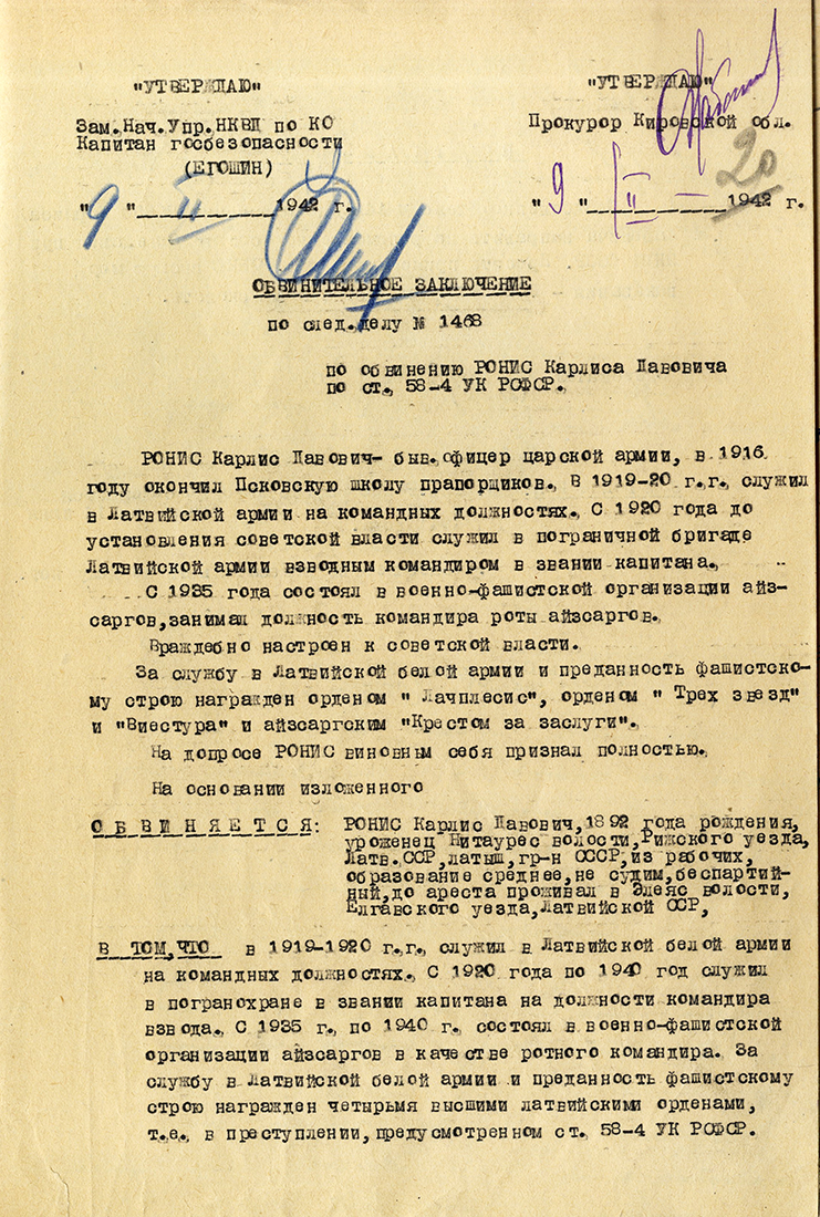 Kā liecina arhīva materiāli, pēc smagas pratināšanas, atrodoties Krievijas Vjatkas 7. nometnē, mana tēva lieta tika nosūtīta izskatīšanai uz “Osoboje soveščaņije pri NKVD SSSR”, uzrādot apsūdzību pēc 58. panta 4. punkta un pieprasot augstāko soda mēru – nošaušanu. Taču tiesas spriedumu nesagaidot, krimināllieta tika izbeigta, jo 1942. gada 24. augustā mans tēvs, Kārlis Reinis Dāvja d. Ronis mira KPFSR Kirovas apgabala Vjatlagā. Kā nāves cēlonis uzrādīts avitaminozais kolīts (īsto nāves datumu vēl šodien nezinu, jo miršanas apliecībā ir 24. augusts, bet reabilitācijas apliecībā, kuru saņēmu 1992. gadā – 23. augusts).