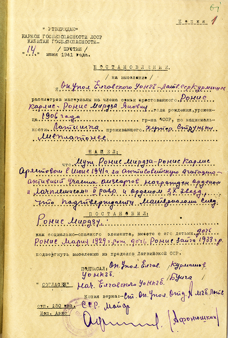 1941. gada 14. jūnija rīts izmainīja visu mūsu dzīvi. Dzīvojām Elejas muitas pārejas punkta plīts istabas dzīvoklī, jo arī mamma bija iekārtojusies turpat darbā. Mēs ar mammu vēl gulējām, kad tēvs, piegājis pie loga, noteica: “Man atbraukuši čekisti pakaļ, mums jāatvadās!” Viņš zināja, ka daudzi bijušie Latvijas virsnieki jau sen arestēti un tagad pienākusi viņa kārta... Notika citādi – istabā iebruka vairāki formās tērpti vīri, lika tēvam pacelt rokas un nekustēties, bet pārējiem ģimenes locekļiem saģērbties, sakravāt mantas, cik var paņemt rokās, un doties līdzi. Par represijām mēs nenojautām. Viņi nepieminēja, kur mēs dosimies, tikai teica, ka esam kaitīgi padomju iekārtai, tāpēc mūs arestē. Karavīri lielākoties bija krievi, tāpēc nevienu nepazinām. deportēja mūs visus, mazāk kā stundas laikā lika sakravāties. Viss notika tādā kā šokā, visi raudāja, tēvs tikai klusēja, pacēlis rokas. Neko īpašu nepaņēmu līdz, vien vecāmamma no otras mājas (mammas brāļa) bija paspējusi iepakot kaut kādas drēbes.