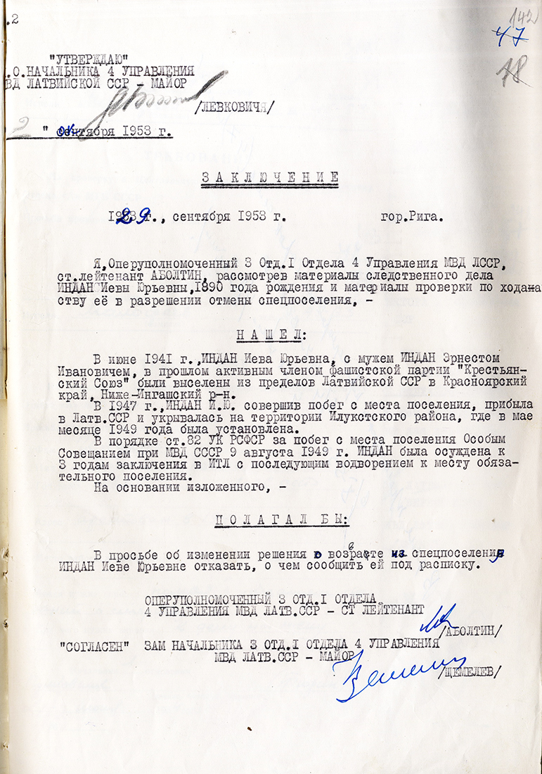 Ernesta Indāna ģimeneIndāns Ernests Jāņa d., dz. 1890, dzīvoja Ilūkstes apriņķa, Aknīstes pagasta Stirnās. Arestēts 14.06.1941., ieslodzīts Vjatlagā. Miris 12.09.1941. Vjatlaga 7. nometnē. LVA, 1987. f., 1. apr. (Ilūkste), 14250. lieta. Sieva Indāne Ieva Jura m., dz. 1890., dzīvoja Ilūkstes apriņķa, Aknīstes pagasta Stirnās. Izsūtīta 14.06.1941. uz Krasnojarskas novada, Ņižņijingašas rajonu. 15.04.1947. atgriezās Latvijā. 19.03.1949. Nosūtīta atpakaļ uz Krasnojarskas novadu. Atbrīvota 07.08.1954. LVA, 1987. f., 1. apr. (Ilūkste), 14250. lieta. Dēls Indāns Vilis Ernesta d., dz. 1923., dzīvoja Ilūkstes apriņķa, Aknīstes pagasta Stirnās. Arestēts 23.06.1941., izsūtīts uz Novosibirskas apgabalu. Miris 16.04.1943. LVA, 1987. f., 1. apr. (Ilūkste), 14250. lieta. Meita Indāne Ērika Ernesta m., dz. 1931, dzīvoja Ilūkstes apriņķa, Aknīstes pagasta Stirnās. Izsūtīta 14.06.1941. uz Krasnojarskas novada, Ņižņijingašas rajonu. Atbrīvota 15.07.1946. LVA, 1987. f., 1. apr. (Ilūkste), 14250. lieta. |