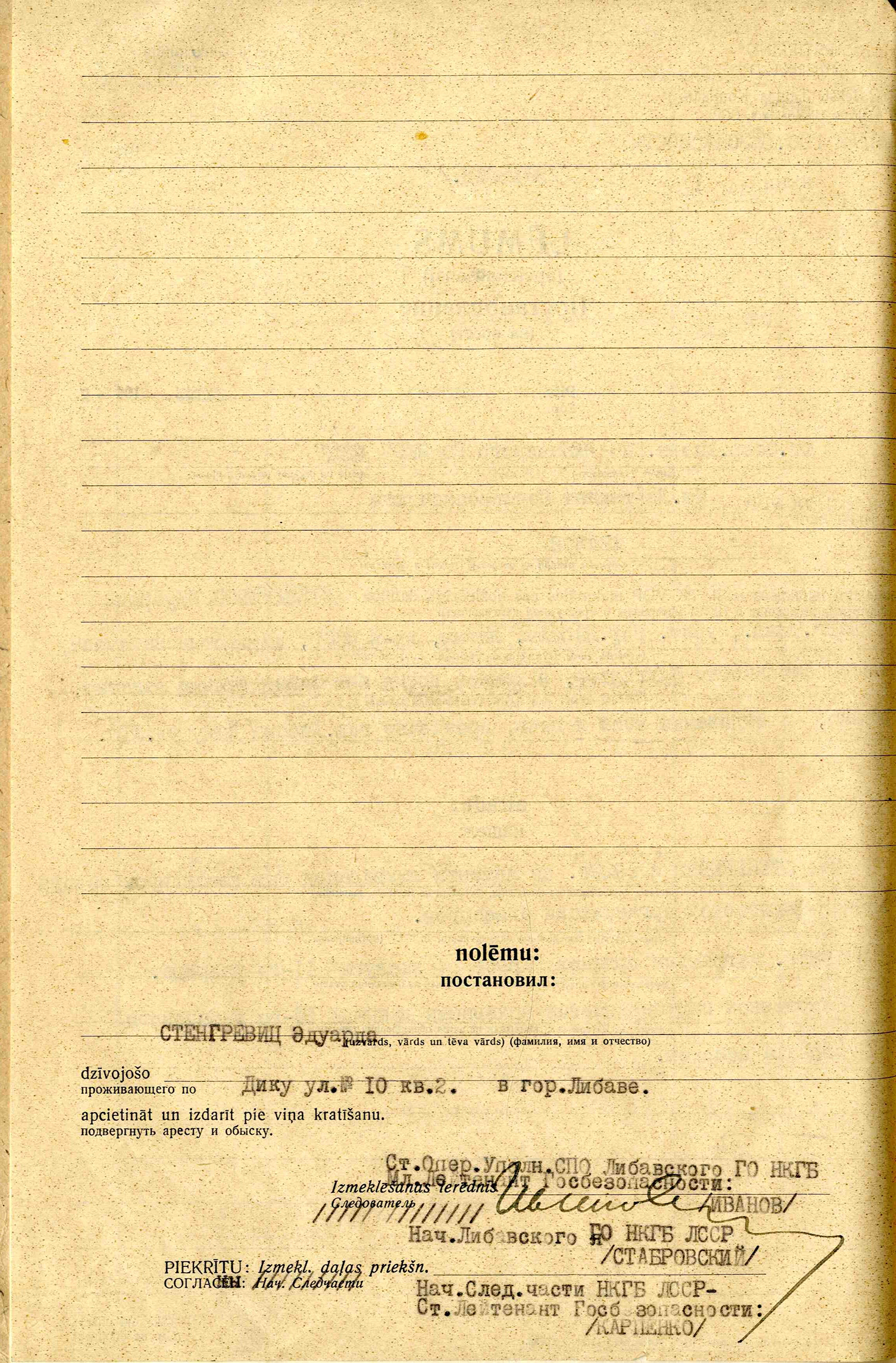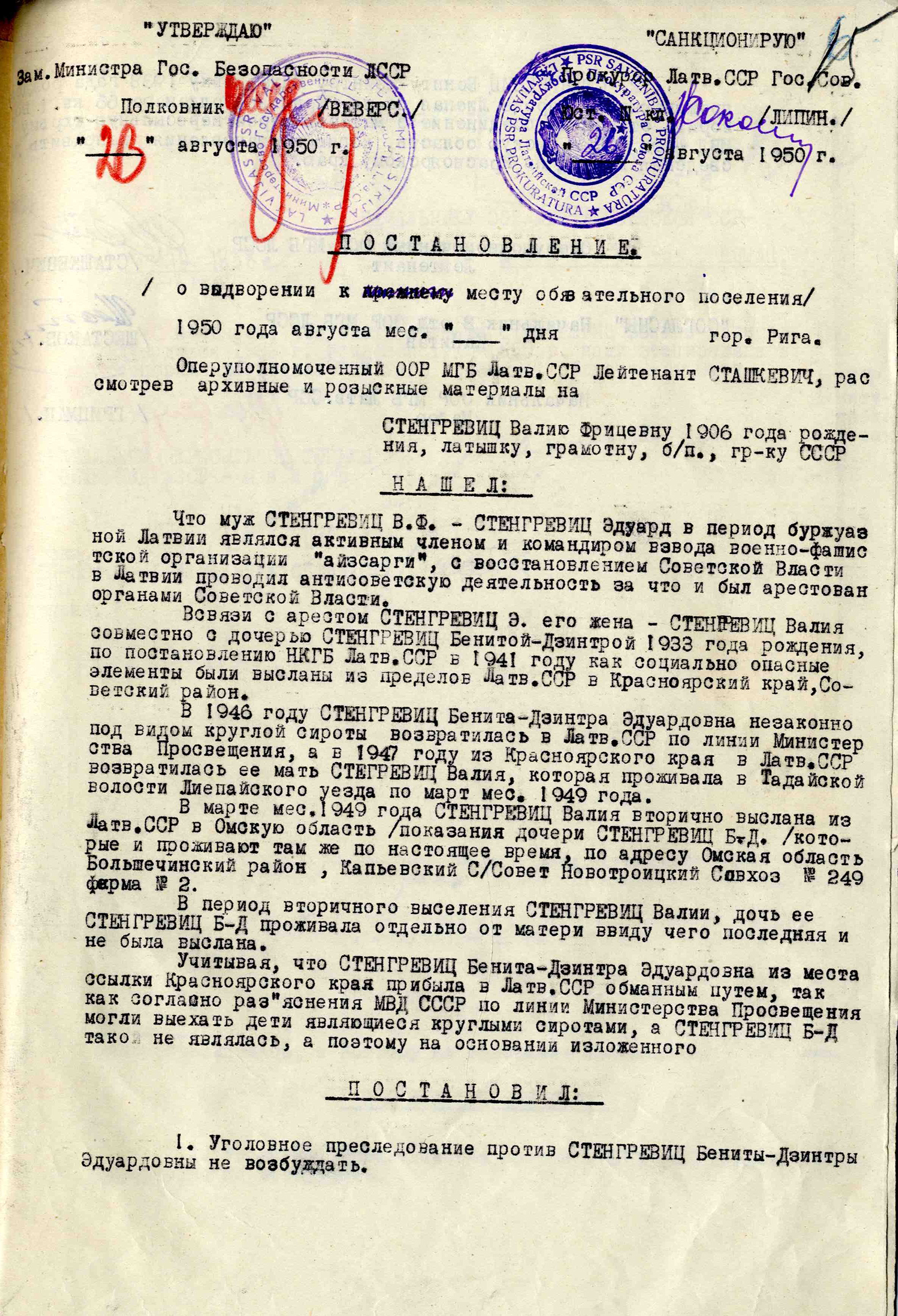 Māte Stengrevica Valija Friča m., dz. 1906, dzīvoja Liepājā, Dīķu iela 10-2, izsūtīta 14.06.1941. uz Krasnojarskas novada Sovetskas rajonu, atbrīvota 06.12.55. Lieta Nr. 15048.
