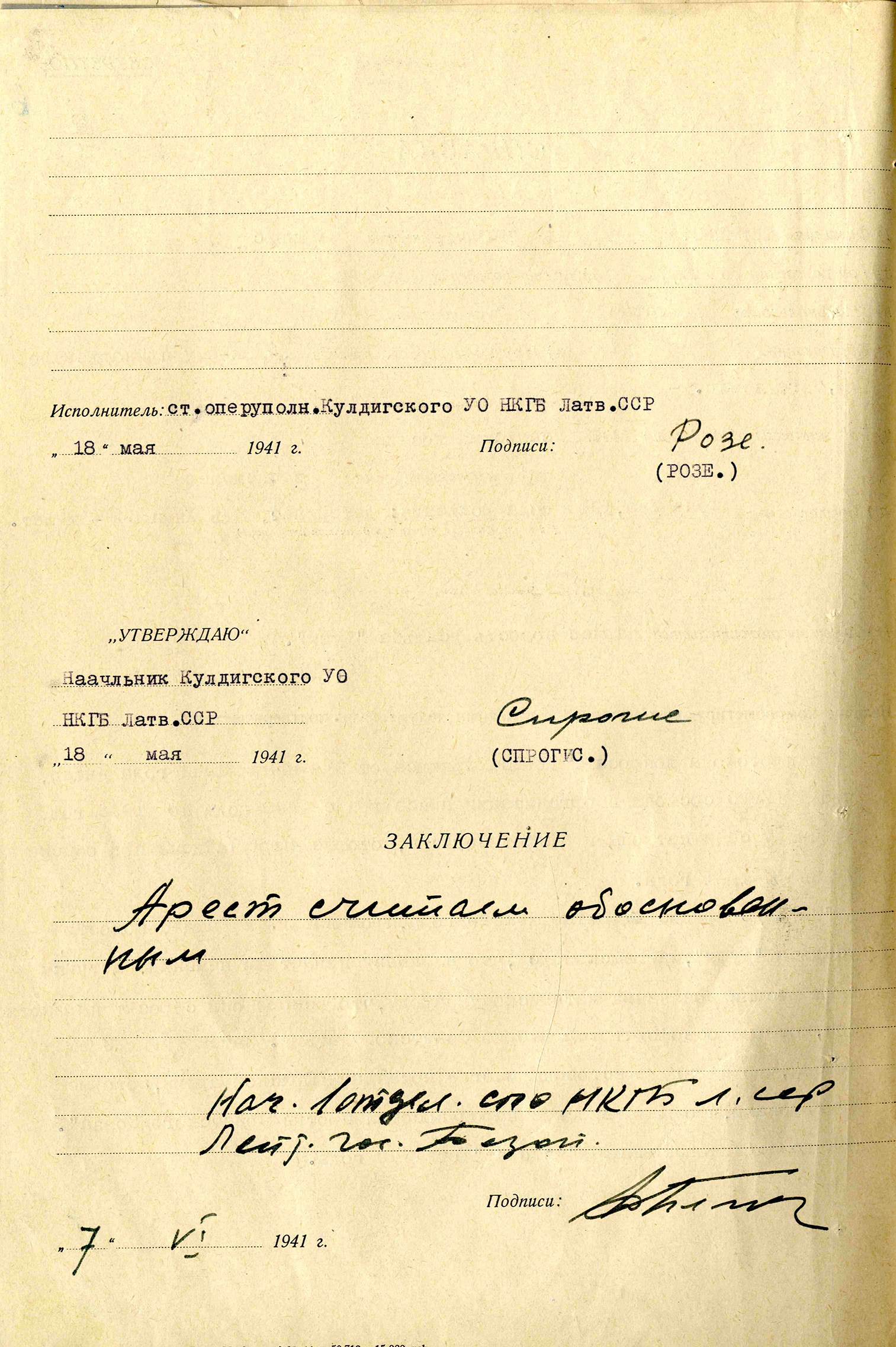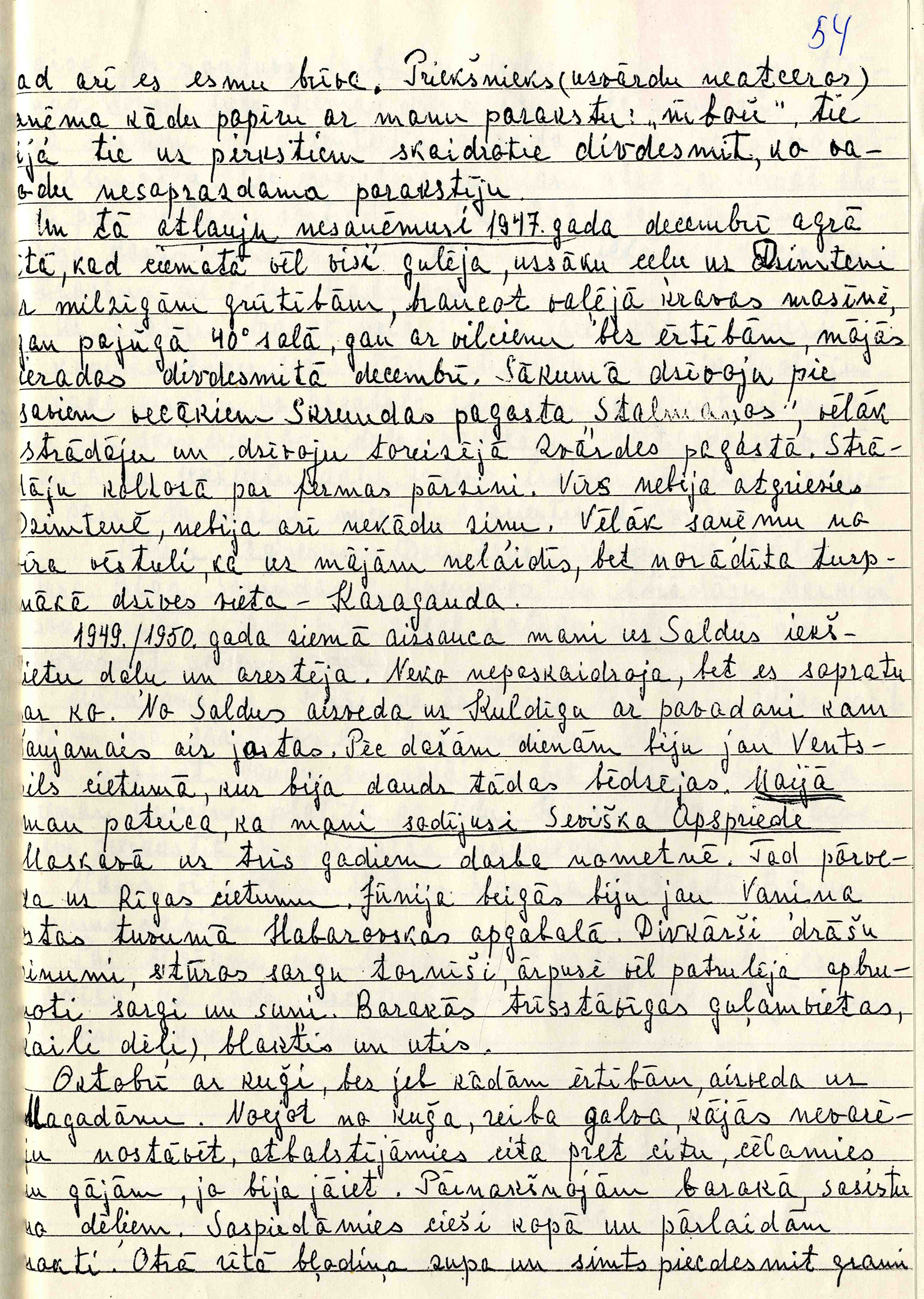 Tad 1949. gadā mani izsauca uz Saldus čeku un apcietināja. Mani pārveda uz Kuldīgu un gandrīz nedēļu dzīvoju arestantu namiņā pie Kuldīgas tiesas nama. Kad mašīna sanāca pilna, mūs veda uz Ventspils cietumu. Mani tiesāja Maskavas troika – osoboje soveščaņije. Notiesāja uz 3 gadiem lāģerī bez tiesībām atgriezties Latvijā.
