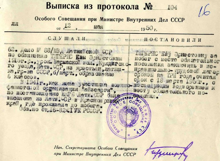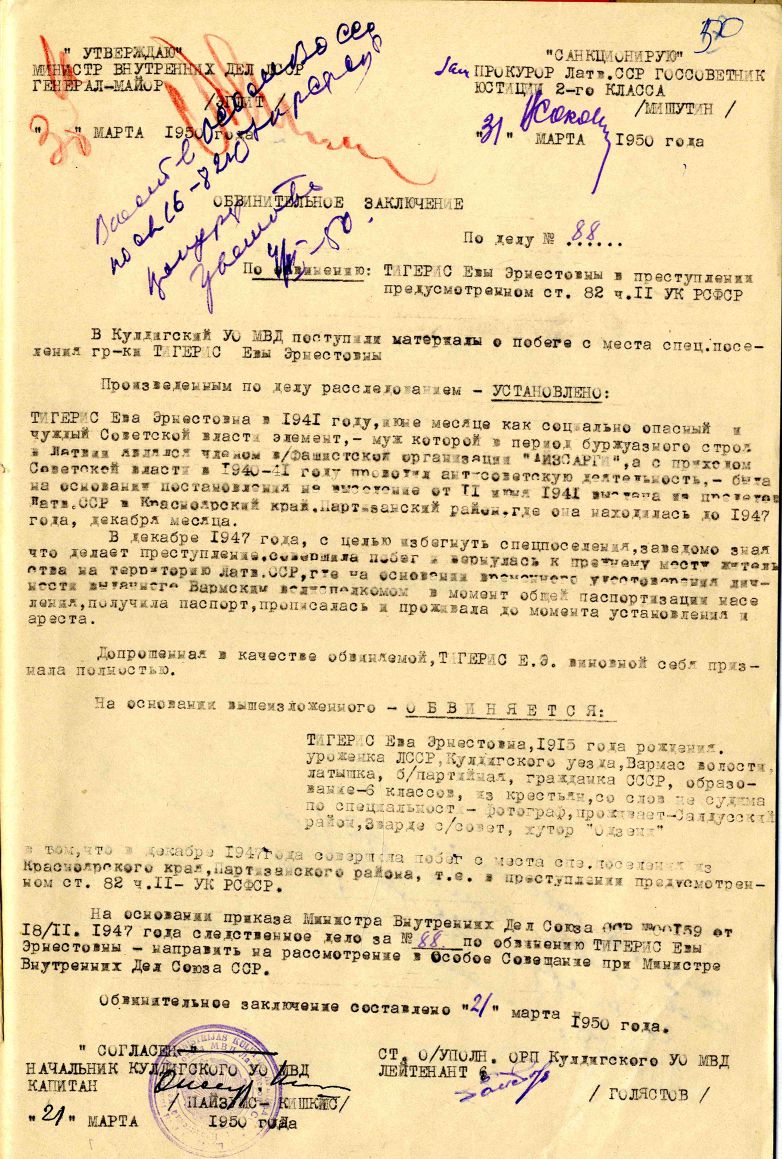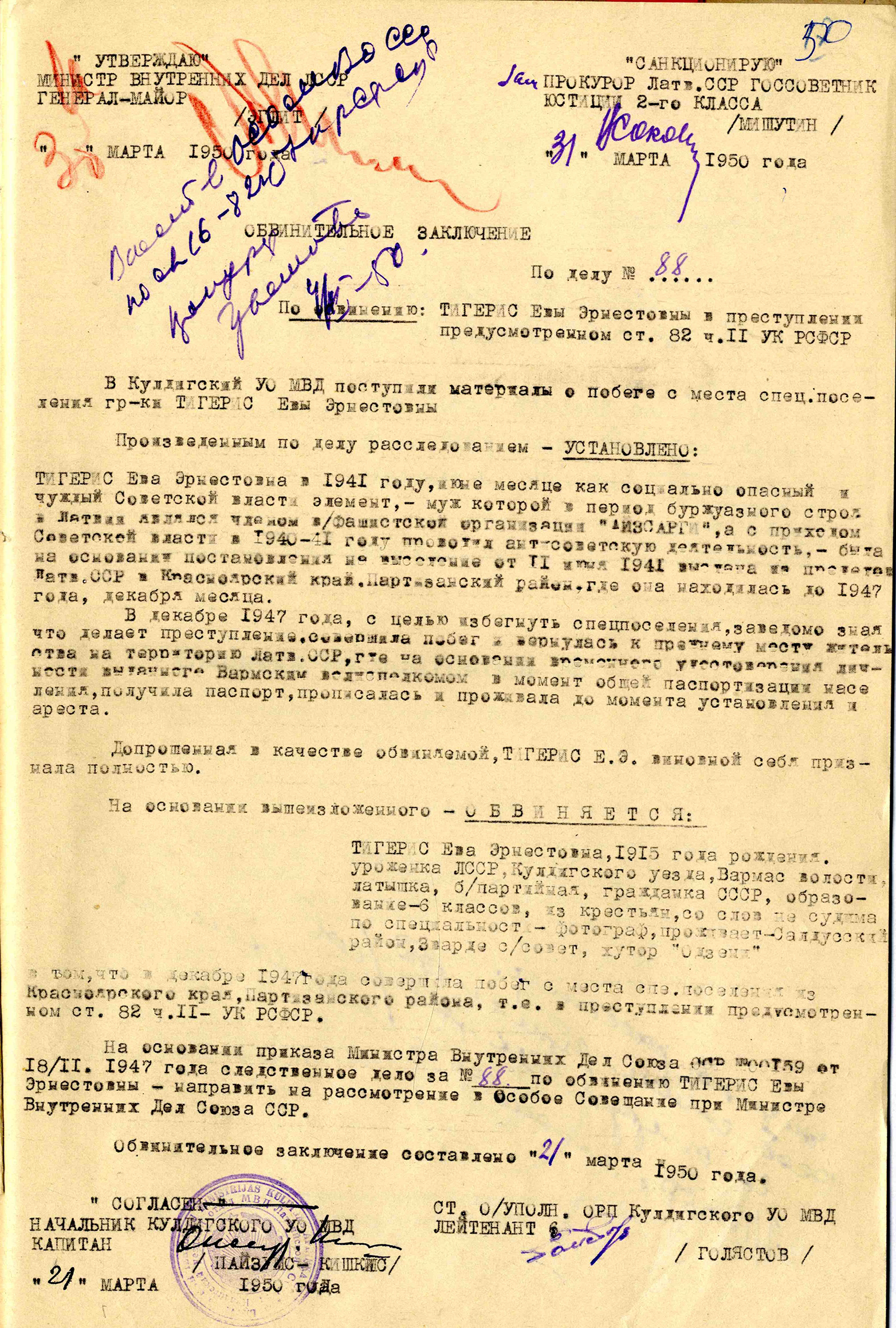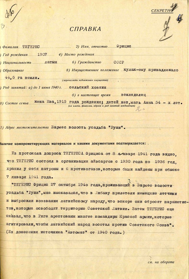 Tīģere Ieva Ernesta m., dz. 1915, dzīvoja Kuldīgas apriņķa Vārmes pagasta Rūšos, izsūtīta 14.06.1941. uz Krasnojarskas novada Partizanskas rajonu, atbrīvota 15.01.57 lieta Nr. 16388.