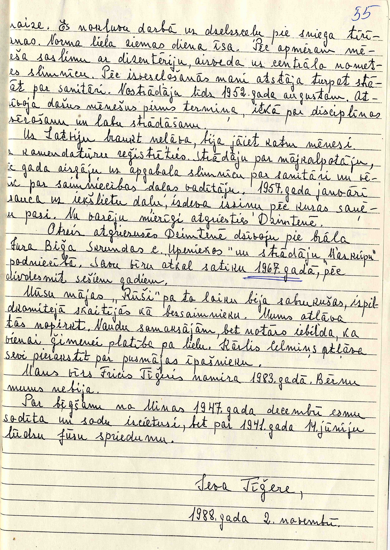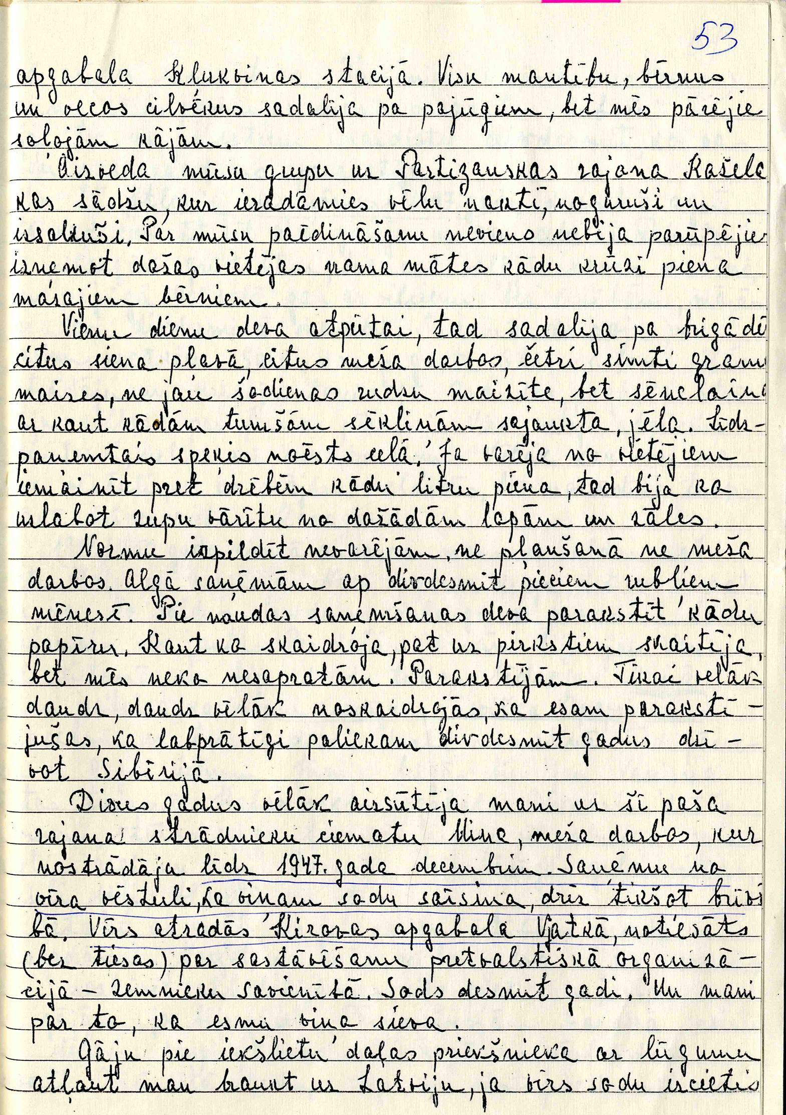 Ventspils cietumā biju tieši kastaņu ziedēšanas laikā. Kamerā bijām 23 sievietes un tikai 3 no mums kriminālnoziedznieces, pārējās – pārbēdzējas. Pārsūtīšanas cietumā sabiju līdz jūnija mēnesim. Tad bija noformēts ešelons un mani pārveda uz buhta Vaņino. Tur visu vasaru nodzīvojām vienās dzeloņdrātīs, jo gaidījām kuģi, kas mūs aizvestu uz Gulaga arhipelāgu. Oktobra beigās mums pateica – savāciet mantiņas. Kuģis beidzot bija pienācis. Kad kāpām kuģī – kriminālās uzvedās šausmīgi – nāca virsū kliegdamas ar šausmīgu troksni. Rāva nost drēbes, kulītes, visu, ko tik varēja. Viņas tā darīja, jo zināja, ka nepadosies un, ka apsardze arī neko neteiks. Mūsu kuģis iekļuva vētrā, slimojām ar jūras slimību. Tas bija viens šausmīgs ārprāts. Aptrūka dzeramā ūdens, jo bijām nomaldījušies no kursa. Kad pa trapu kāpām nost no kuģa, drēbes bija piesūkušās ar mitrumu, bet te uz sauszemes – sals. Tā nonācām Magadanā. Pa četri rindā aizveda mūs uz zaldātu vasaras nometni. Vienā kaktiņā gan bleķa krāsniņa bija, bet tā mūs sildīt nespēja. To nakti kaut kā pārlaidām. No rīta pirmo reizi dabūjām kārtīgas brokastis: "kaša", eļļas pilīte un saldināta tēja. Ēdām ilgi, ilgi, lai varam izgaršot. Tad pirts un sadale pa barakām. Darbā es nokļuvu uz dzelzceļa. Bija jātīra apmēram 1 m dziļš sniegs no sliedēm. Pusdienas dabūju vakarā, kad darbs bija izdarīts, bet vispār cilvēcīgos apstākļos dzīvojām. Bleķa gultiņas, silta telpa. Tad es ļoti smagi saslimu. Mani aizveda uz lēģera centrālo slimnīcu Magadanā. Guļot slimnīcā iepatikos māsiņai uzbekietei. Viņa sāka teikt ārstam Vladimiram Mihailovičam, lai mani patur slimnīcā par sanitāri. Tā es tur paliku un atkopos. Darbos no turienes mūs nedzina. Slimnīcā sabiju līdz 1957. gadam. Mani atbrīvoja 3-4 mēnešus agrāk. Sāku strādāt turpat aiz lēģera saimniecībā. Katru mēnesi bija jāiet komandantūrā reģistrēties. Vēl iznāca strādāt par mājkalpotāju, tad atpakaļ uz slimnīcu par māsu saimnieci. 1957. gadā atgriezos Latvijā, aizbraucu pie brāļa uz "Cīņu" un sāku strādāt "Mazkripu" podniecībā. Tur nostrādāju 13 gadus, līdz 1970. gadam. Tad man bija 55 gadi un aizgāju pensijā.