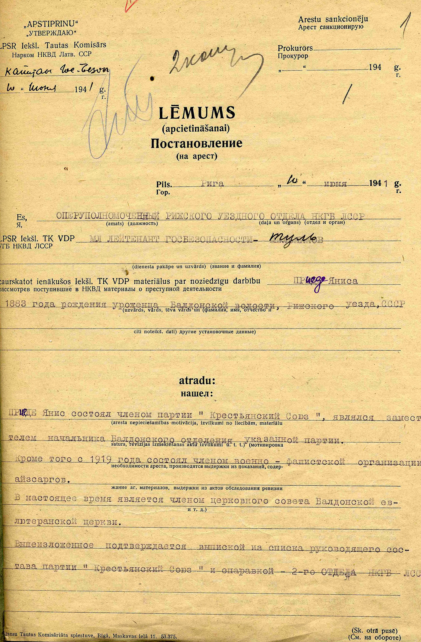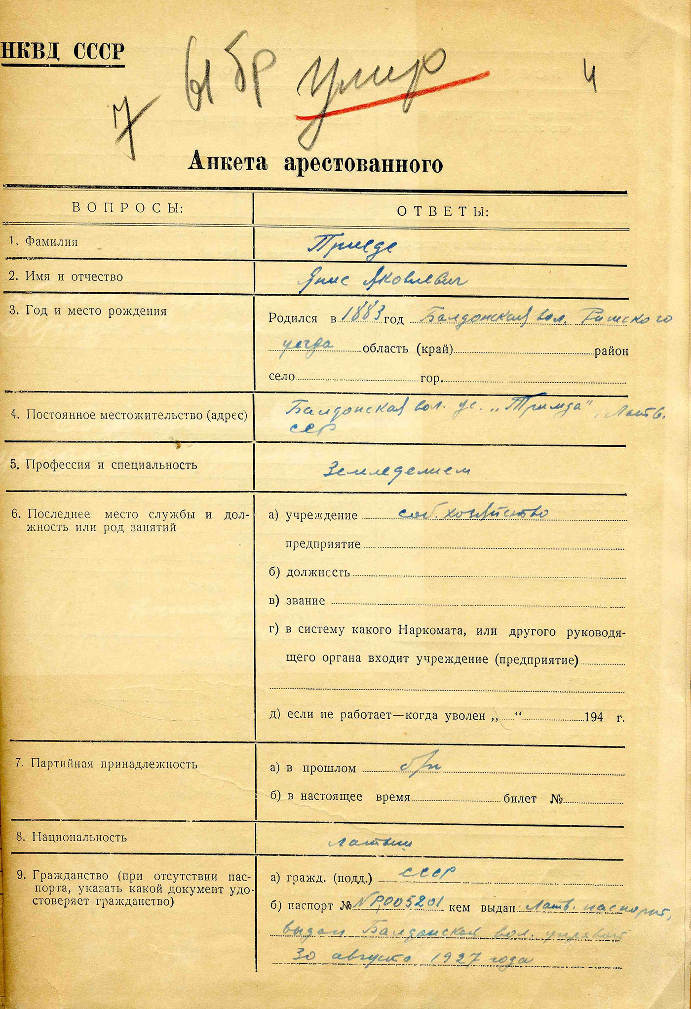 Tēvs Priede Jānis Jēkaba d., dz. 1883, dzīvoja Rīgas apriņķa Baldones pagasta Trimdās, arestēts 14.06.1941., ieslodzīts Kirovas apgabala Vjatlagā, miris 21.12.41. Lieta Nr. 20813.