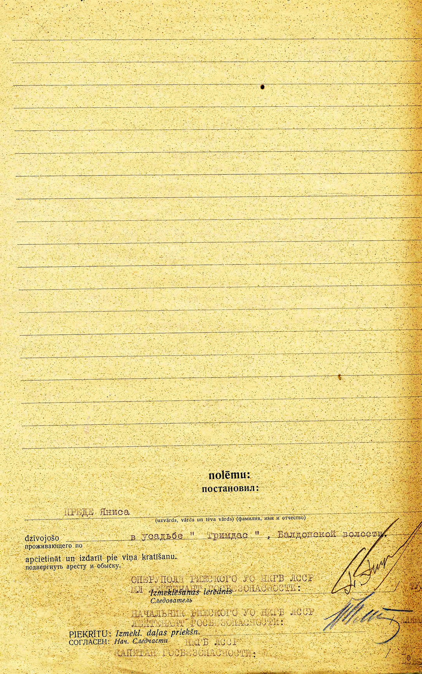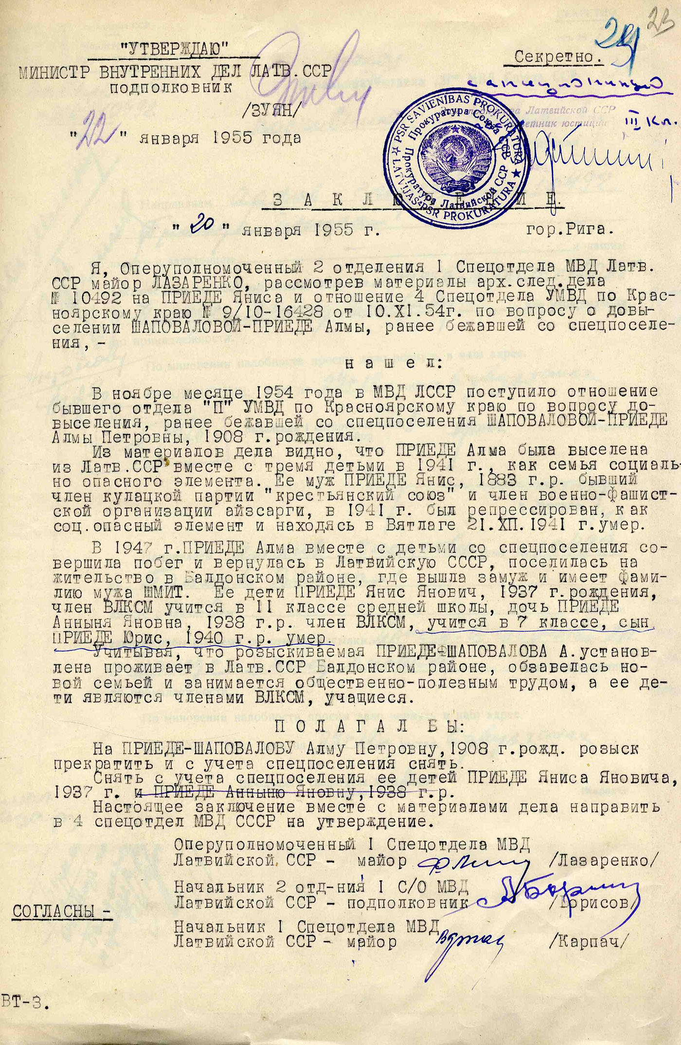 Māte Priede Alma Pētera m., dz. 1908, dzīvoja Rīgas apriņķa Baldones pagasta Trimdās, izsūtīta 14.06.1941. uz Krasnojarskas novada Kazačinskas rajonu, atbrīvota 15.06.48. Lieta Nr. 20813.