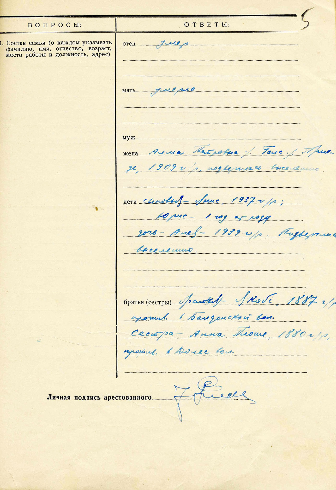 1941. gada 14. jūnijā mūsu ģimeni apcietināja un izsūtīja uz Sibīriju. Man tad bija 4 gadi, māsiņai Annijai nepilni 3 gadi, bet brālītim Jurim tikai 8 mēneši.