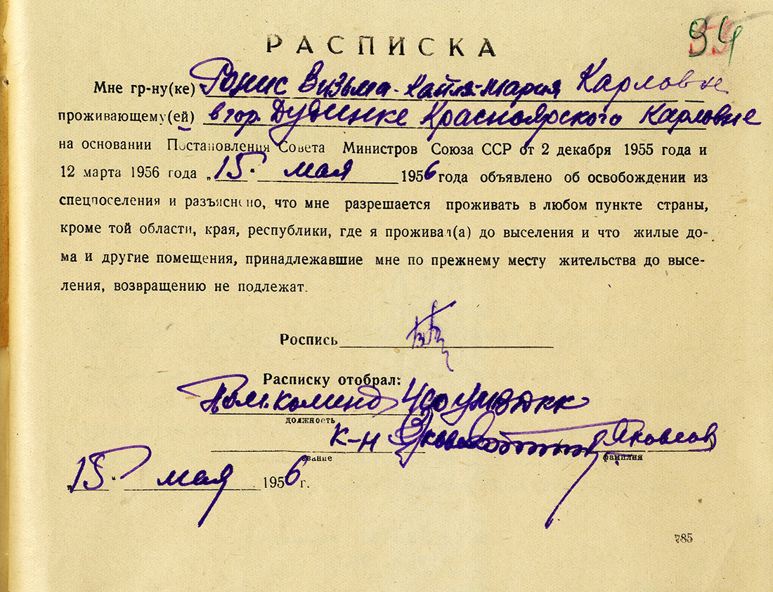 Mūs izsēdināja no vagoniem Krasnojarskas apgabalā stacijā “Kļukvennaja”. Tur notika tā saucamā sadale. Kopā ar Niedru ģimeni nokļuvām Krasnojarskas novada Manskas rajona kolhozā “Targinka”. Kad pajūgu grupa iebrauca sādžā, kolhoznieki uzkrītošā veidā saskrēja skatīties uz mums – kādi izskatās tie Latvijas buržuji. Mūs – 4 ģimenes izvietoja nelielā būdā. Vajadzēja ēst, bet kolhozs bija nabadzīgs. Mums izsniedza nelieli graudu devu avansā, kuru atpelnījām tikai līdz rudenim, smagi strādājot. Mamma gāja vissmagākajos darbos. Strādājot pie kuļmašīnas un cilājot graudu maisus, viņa gandrīz gāja bojā, jo uz lauka bija iekritusi kādā milzīgā bedrē. Traktorists viņu atrada. 12 gadu vecumā darbā iesaistījos arī es. Pļāvām sienu, grābām, likām kaudzēs. Uz rudens pusi gājām “pa kluso” uz lauku vārpas lasīt, jo nebija ko ēst. Tā arī kolhozs par nostrādātajām darba dienām neko neizmaksāja, jo viss esot “apēsts” avansā. Mamma staigāja pa vietējo iedzīvotāju būdām, iemainīdama vēl dažas līdzpaņemtās drēbes pret litru piena vai dažiem kilogramiem miltu. Sākumā katru nedēļu vajadzēja iet atzīmēties, ka vēl esam tur, vēlāk reizi mēnesī.