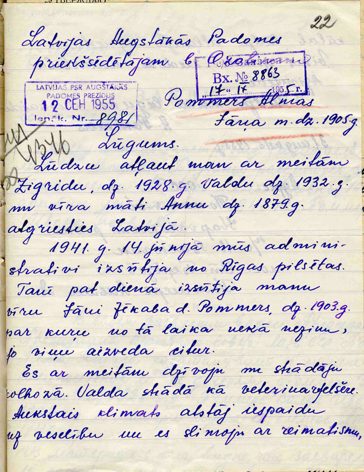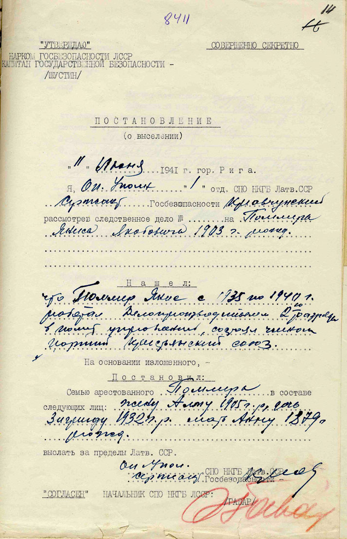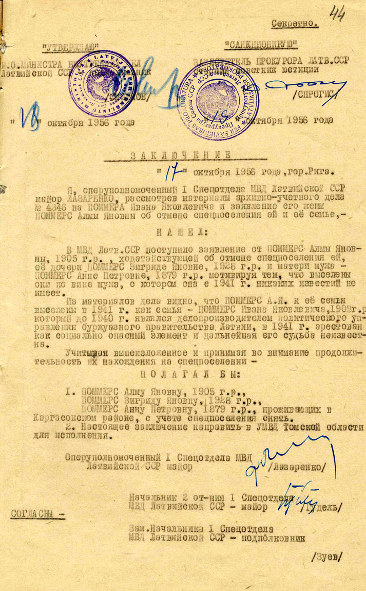 Zigrīdas Pommeres ģimenePommere Zigrīda Jāņa m., dz. 1928, dzīvoja Rīgā, Ganību dambī 5-4, izsūtīta 14.06.1941. uz Novosibirskas apgabala Kargasokas rajonu, atbrīvota 15.11.57. Lieta Nr. 16271. Tēvs Pommers Jānis Jēkaba d., dz. 1903, dzīvoja Rīgā, Ganību dambī 5-4,, arestēts 14.06.1941., ieslodzīts Molotovas apgabala Usoļlagā, nošauts 06.04.42. Lieta Nr. 16271, P-6524. Māte Pommere Alma Pētera m., dz. 1905, dzīvoja Rīgā, Ganību dambī 5-4, izsūtīta 14.06.1941. uz Novosibirskas apgabala Kargasokas rajonu, atbrīvota 18.10.56. Lieta Nr. 16271. Tēva māte Pommere Anna Pētera m., dz. 1879, dzīvoja Rīgā, Ganību dambī 5-4, izsūtīta 14.06.1941. uz Novosibirskas apgabala Kargasokas rajonu, atbrīvota 18.10.56. Lieta Nr. 16271. Māsa Pommere Valda Jāņa m., dz. 1932, dzīvoja Rīgā, Ganību dambī 5-4, izsūtīta 14.06.1941. uz Novosibirskas apgabala Kargasokas rajonu, atbrīvota 15.11.57. Lieta Nr. 16271. |