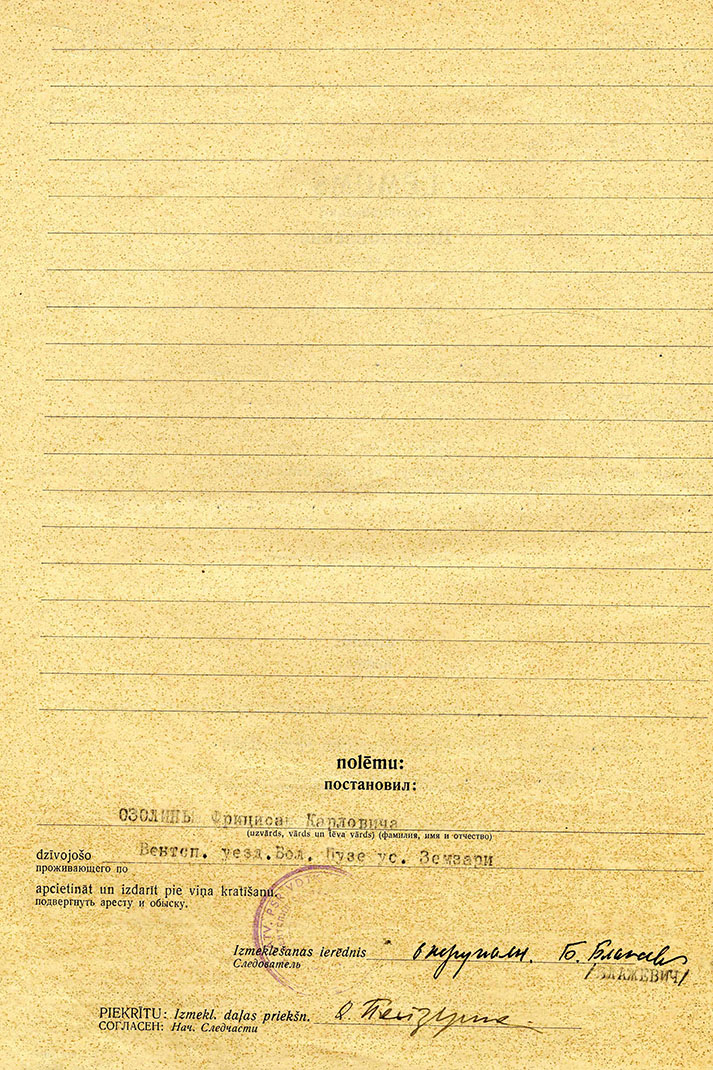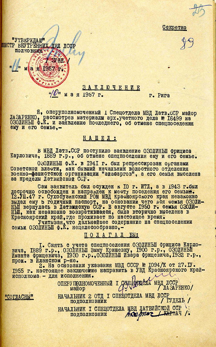 Tēvs Ozoliņš Fricis Kārļa d., dz. 1895, dzīvoja Ventspils apriņķa Puzes pagasta Zemzaros, arestēts 14.06.41, ieslodzīts Kirovas apgabala Vjatlagā, atbrīvots 30.10.43, pēc tam nometinājumā Krasnojarskas novada Suhobuzimskas rajonā, bēdzis 28.08.47, nosūtīts atpakaļ 16.09.50, atbrīvots, 30.05.57. Lieta Nr.16499.