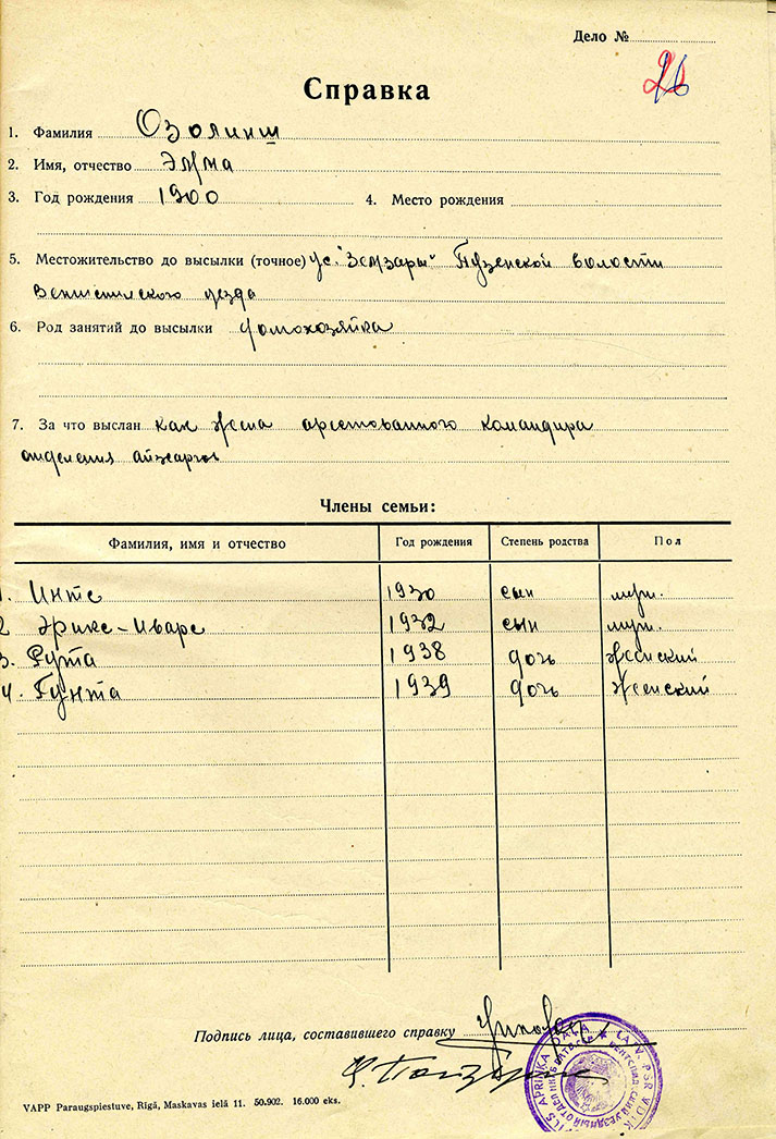 Māte Ozoliņa Emma Kriša m., dz. 1900, dzīvoja Ventspils apriņķa Puzes pagasta Zemzaros izsūtīta 14.06.41 uz Krasnojarskas novada Suhobuzimskas rajonu, bēgusi 28.08.47, nosūtīta atpakaļ 16.09.50, atbrīvota 30.05.57. Lieta Nr.16499.