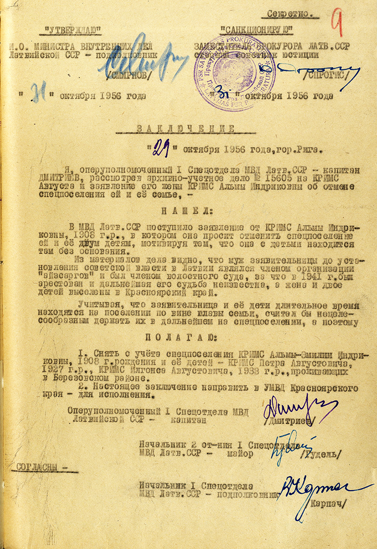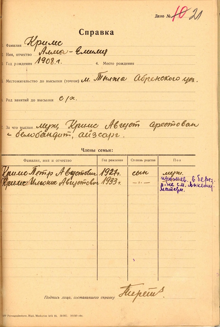 Pētera Krima ģimenePēteris Krims Augusta d., dz. 1927, dzīvoja Abrenes apriņķa Tilžas pagastā, izsūtīts 14.06.1941 uz Krasnojarskas novada Berjozovskas raj., atbrīvots 29.11.1956. LVA, 1987. f., 1. apr. (Abrene), 15605. l. Tēvs Krims Augusts Pētera d., dz.1876, dzīvoja Abrenes apriņķa Tilžas pagastā, 14.06.1941 nosūtīts uz Sverdlovskas apgabalu Sevurallags, nošauts 18.08.1942. LVA, 1987. f., 1. apr. (Abrene), 15605. l.; LVA, 1986. f., 2. apr., P-6677. l. Māte Krima Alma Indriķa m., dz.1908, dzīvoja Abrenes apriņķa Tilžas pagastā, izsūtīta 14.06.1941 uz Krasnojarskas novada Berjozovskas raj., atbrīvota 29.11.1956. LVA, 1987. f., 1. apr. (Abrene), 15605. l. Brālis Krims Ilgonis Augusta d., dz. 1933, dzīvoja Abrenes apriņķa Tilžas pagastā, izsūtīts 14.06.1941. uz Krasnojarskas novada Berjozovskas raj., atbrīvots 29.11.1956. LVA, 1987. f., 1. apr. (Abrene), 15605. l. |