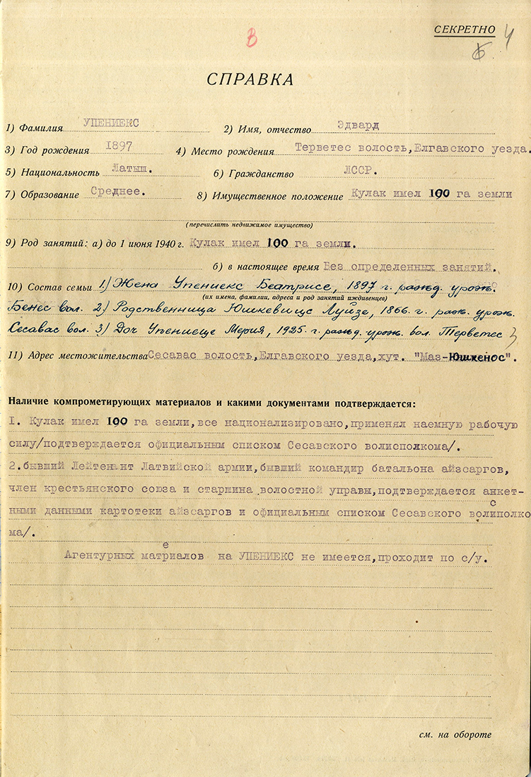 Mērijas un Gunāra Upenieku ģimeneUpenieks Gunārs Eduarda d., dz. 1927, dzīvoja Jelgavas apriņķa, Tērvetes pagasta Puntēs. Izsūtīts 14.06.1941. uz Krasnojarskas novada, Sajānu rajonu. Atbrīvots 21.12.1956. LVA, 1987. f., 1. apr. (Jelgava), 17459. lieta. Māsa Upeniece Mērija Eduarda m., dz. 1926, dzīvoja Jelgavas apriņķa, Tērvetes pagasta Puntēs. Izsūtīta 14.06.1941. uz Krasnojarskas novada, Sajānu rajonu. Atbrīvota 21.12.1956. LVA, 1987. f., 1. apr. (Jelgava), 17459. lieta. Tēvs Upenieks Eduards Dāvida d., dz. 1897, dzīvoja Jelgavas apriņķa, Tērvetes pagasta Puntēs. Arestēts 14.06.1941., ieslodzīts Vjatlagā. Miris 10.06.1944. Vjatlaga 4. nometnes lazaretē. LVA, 1986. f., 2. apr., P-6354. lieta. LVA, 1987. f., 1. apr. (Jelgava), 17459. lieta. Māte Upeniece Beatrise Jāņa m., dz. 1897, dzīvoja Jelgavas apriņķa, Tērvetes pagasta Puntēs. Izsūtīta 14.06.1941. uz Krasnojarskas novada, Sajānu rajonu. Mirusi 27.09.1947. Igarkā. LVA, 1987. f., 1. apr. (Jelgava), 17459. lieta. |