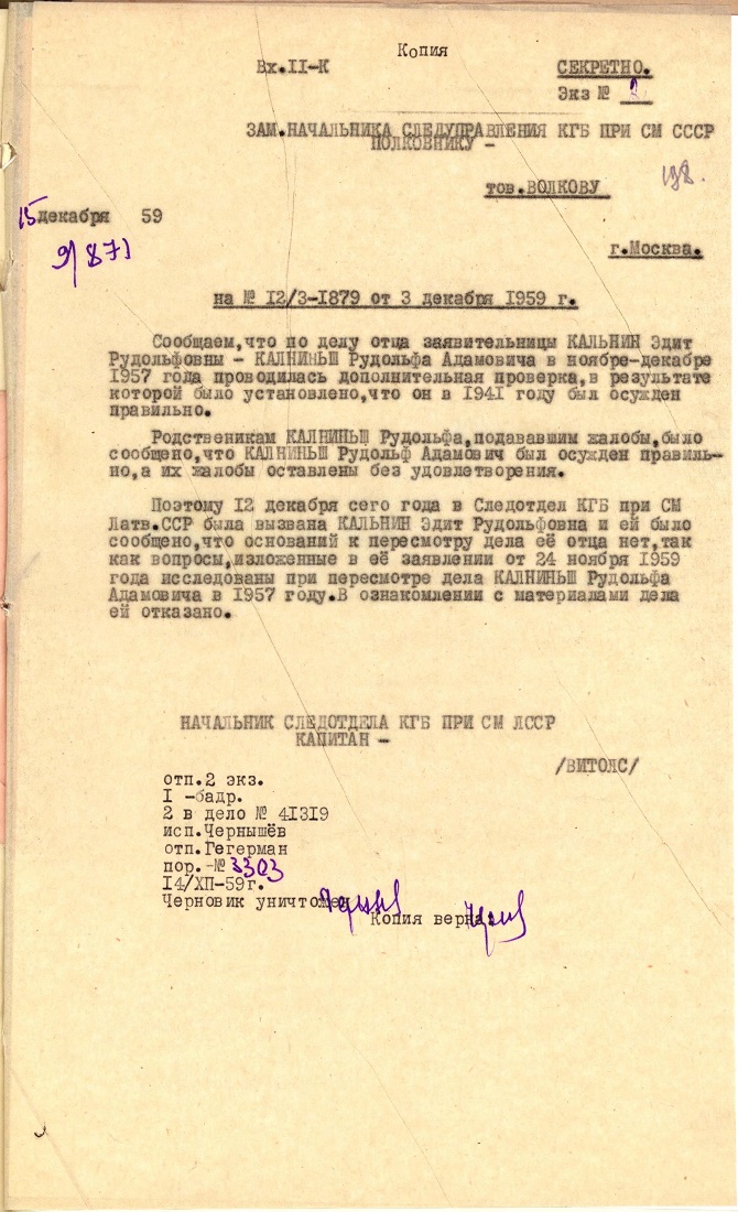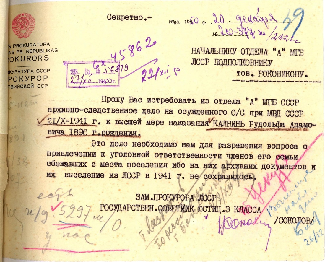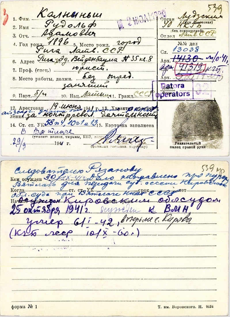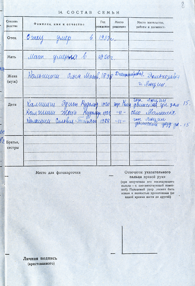 Silvijas Tenases (dzimusi Kalniņa) ģimeneKalniņa Silvija Tatjana Rūdolfa m., 1928, dzīvoja Ludzā, Daugavpils ielā 5. Izsūtīta 14.06.1941. uz Krasnojarskas novada Ilanskas rajonu. Atbrīvota 15.10.1946. LVA, 1987. f., 1. apr. (Ludza), 20024. lieta. Tēvs Kalniņš Rūdolfs Ādama d., 1896, dzīvoja Ludzā, Daugavpils ielā 5. Arestēts 20.06.1941., ieslodzīts Vjatlagā, miris 06.01.1942. Kirovas cietuma slimnīcā. LVA, 1986. f., 1. apr., 41319. lieta; LVA, 1987. f., 1. apr. (Ludza), 20024. lieta. Māte Kalniņa Olga Mihaila m., 1905, dzīvoja Ludzā, Daugavpils ielā 5. Izsūtīta 14.06.1941. uz Krasnojarskas novada Ilanskas rajonu. 15.11.1946. atgriezās Latvijā. 12.09.1950. nosūtīta atpakaļ uz Krasnojarskas novadu. Atbrīvota 28.02.1956. LVA, 1987. f., 1. apr. (Ludza), 20024. lieta. Māsa Kalniņa Edīte Rūdolfa m., 1921, dzīvoja Ludzā, Daugavpils ielā 5. Izsūtīta 14.06.1941. uz Krasnojarskas novada Ilanskas rajonu. Atbrīvota 28.02.1956. LVA, 1987. f., 1. apr. (Ludza), 20024. lieta. |