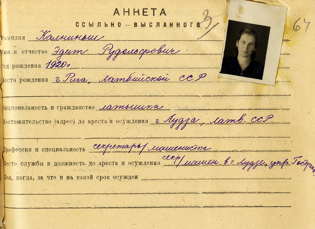 1941. gada 13. jūnija vakarā mēs bijām [Ludzā] Tautas namā, skatījāmies kino, kur, atceros, skanēja mūzikaa «Любимый город может спать спокойно» [krievu val.: mīļotā pilsēta var gulēt mierīgi]. Pēkšņi, plkst. 3:00 naktī mūs pamodināja vīrieši ar ieročiem, pavēlēja celties un savākt savas mantas. Tā mūs aizveda uz Sibīriju, bet Žeņa ar tēvu palika Latvijā. Tēvs ne uz ilgu laiku. Kad viņš uzzināja par mūsu aizvešanu, viņš pēc divām dienām no Rīgas brauca uz Ludzu, bet šeit Ludzā dzelz[ceļa] stacijā viņu jau sagaidīja milicijas pārstāvji. Paņēma ciet un aizveda ar citu ešelonu un uz citu vietu. Viņu aizveda kopā ar Ošupu, Ludzas pilsētas iedzīvotāju. Un viss, par tēva tālāko likteni mēs neko nezinājām līdz pašai mūsu reabilitācijai. Tēvu aizveda uz Vjatlagu, kur viņš nomira 1942. gadā, gāja bojā kā daudzi citi. Mūs pārveda uz Komsomoļsku pie Amūras. Edīte bija Igarkā.