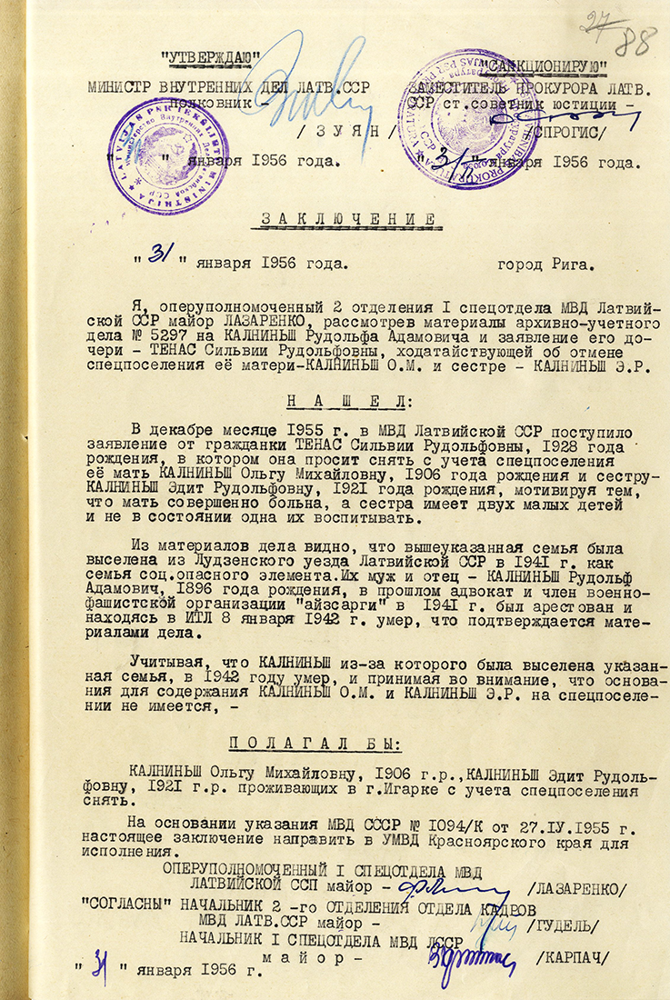 Mana māte pēc atbrīvošanas atgriezās uz Latviju un dzīvoja Rīgā. Viņa atgriezās 1948. gadā, bet 1950. gadā viņu atkal izsūtīja uz Soļikamskas pilsētu Kazačinskas rajonā un [Latvijā] viņa atgriezās tikai 1956. gadā. Bet māsa Edīte bija atbrīvota no ieslodzījuma [faktiski – specnometinājuma] Igarkā uz brīvu apmetni 1957. gadā.
