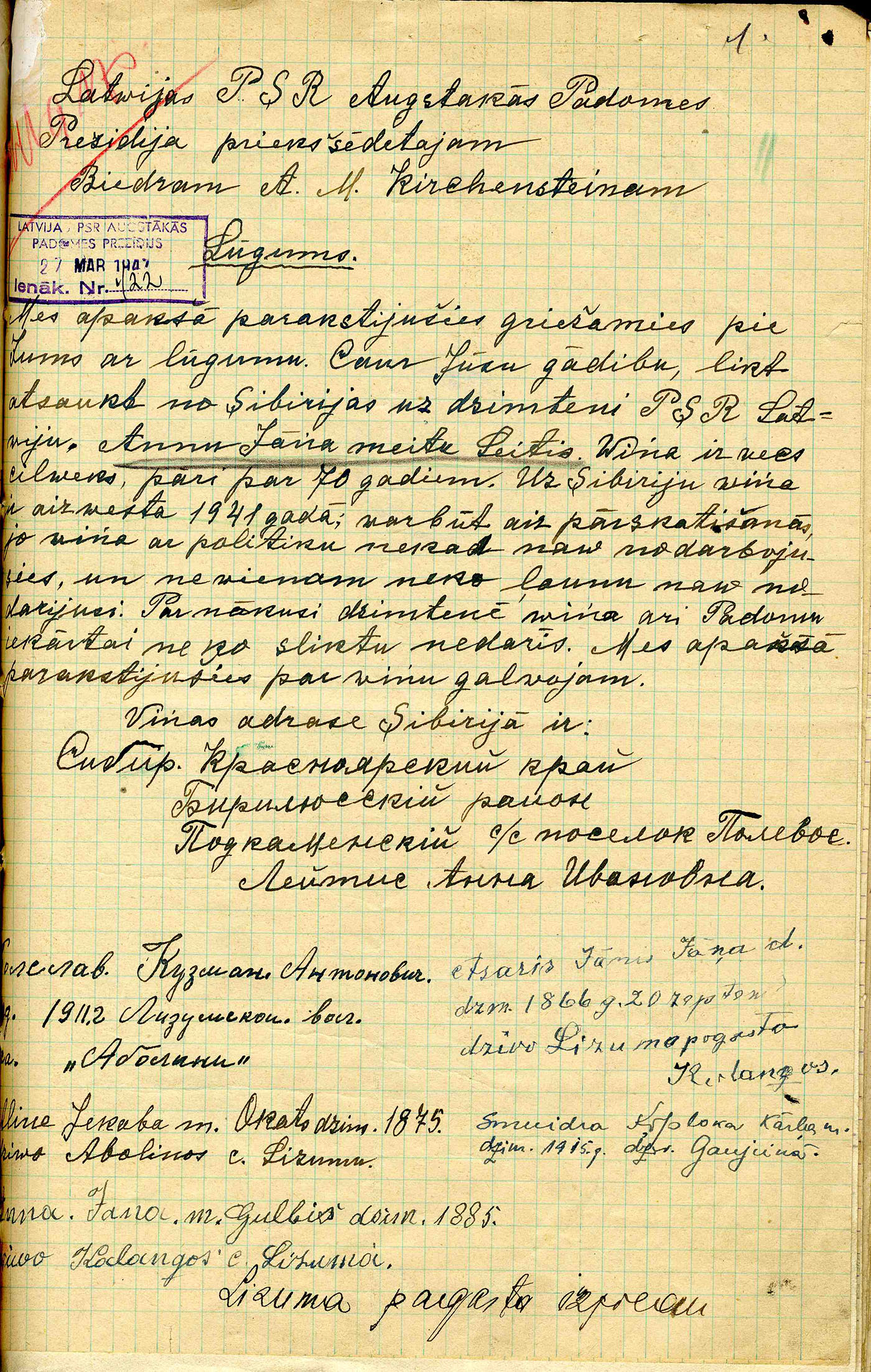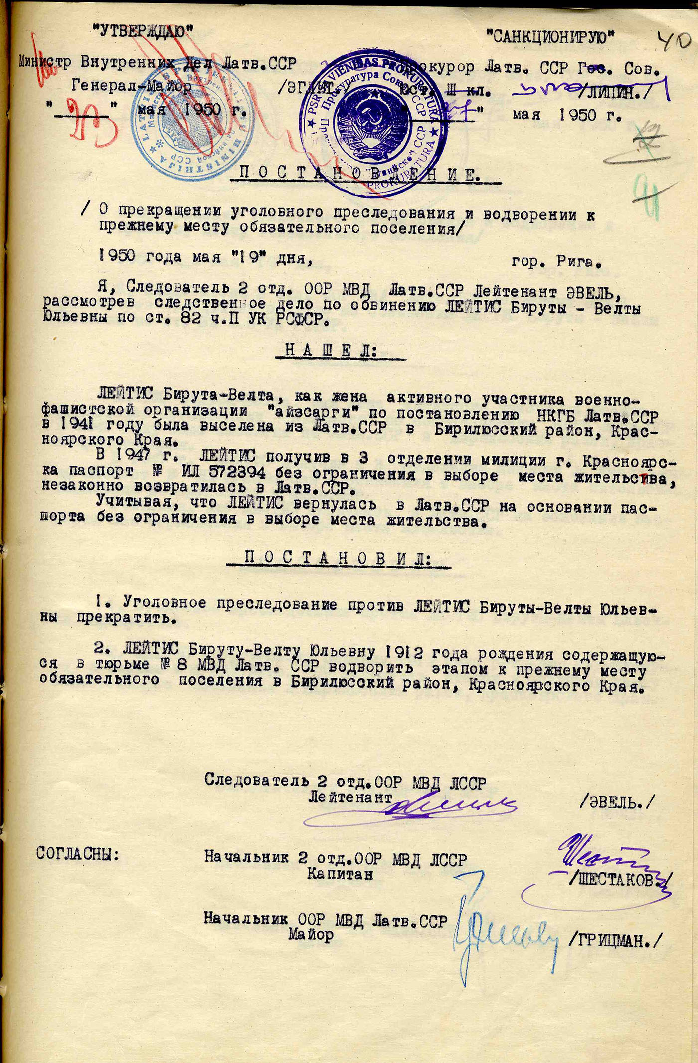 Birutas Leites ģimeneLeite Biruta Jūlija m., dz. 1911, dzīvoja Cēsu apriņķa Lizuma pagasta Viņķeļos, izsūtīta 14.06.1941. uz Krasnojarskas nov. Biriļusu rajonu, bēgusi 15.07.47., nosūtīta atpakaļ 25.04.50., atbrīvota 13.11.54. Lieta Nr. 17306. Vīrs Leitis Jānis Jāņa m., dz. 1907, dzīvoja Cēsu apriņķa Lizuma pagasta Viņķeļos, arestēts 14.06.1941., ieslodzīts Sverdlovskas apgabala Sevurallagā, nošauts 18.08.42. Lieta Nr. 17306, P-7974. Vīramāte Leite Anna Jāņa m., dz. 1875, dzīvoja Cēsu apriņķa Lizuma pagasta Viņķeļos, izsūtīta 14.06.1941. uz Krasnojarskas nov. Biriļusu rajonu, mirusi 1947. gadā. Lieta Nr. 17306. |