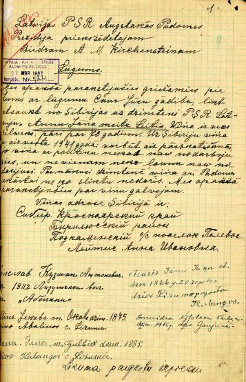 Tā kā ar Latviju jau varēja sarakstīties 1946. gadā, tad uzzināju līdzīgas vēstis, par kurām jau iepriekš rakstīju. Sarakstījos ar vairākām paziņu ģimenēm, bet vēl arvien nezināju, kur atrodas mans tēvs. To uzzināju tikai 1954. gadā, kad biju jau no otrās izsūtīšanas atgriezusies. Kad saņēmu no Amerikas J. Stukmaņa (Ustupi) vēstuli un atsūtītās zāles Jānītim, kurš pēc Sibīrijas „labās dzīves” bija saslimis ar TBC smagā formā, tad arī Stukmanis atsūtīja man tēva adresi Melburnā. Tēvs zinājis, ka esmu mājās, bet baidījies rakstīt man, ka ar mūsu sarakstīšanos man nedraudētu kas ļauns. Lai arī kas man draudētu, savu tēvu es ne mūžam nenoliegšu, jo visu labo, ko viņš un māmiņa man mācījuši, mani izvadīja droši cauri visai dzīvei, visām nebūšanām.