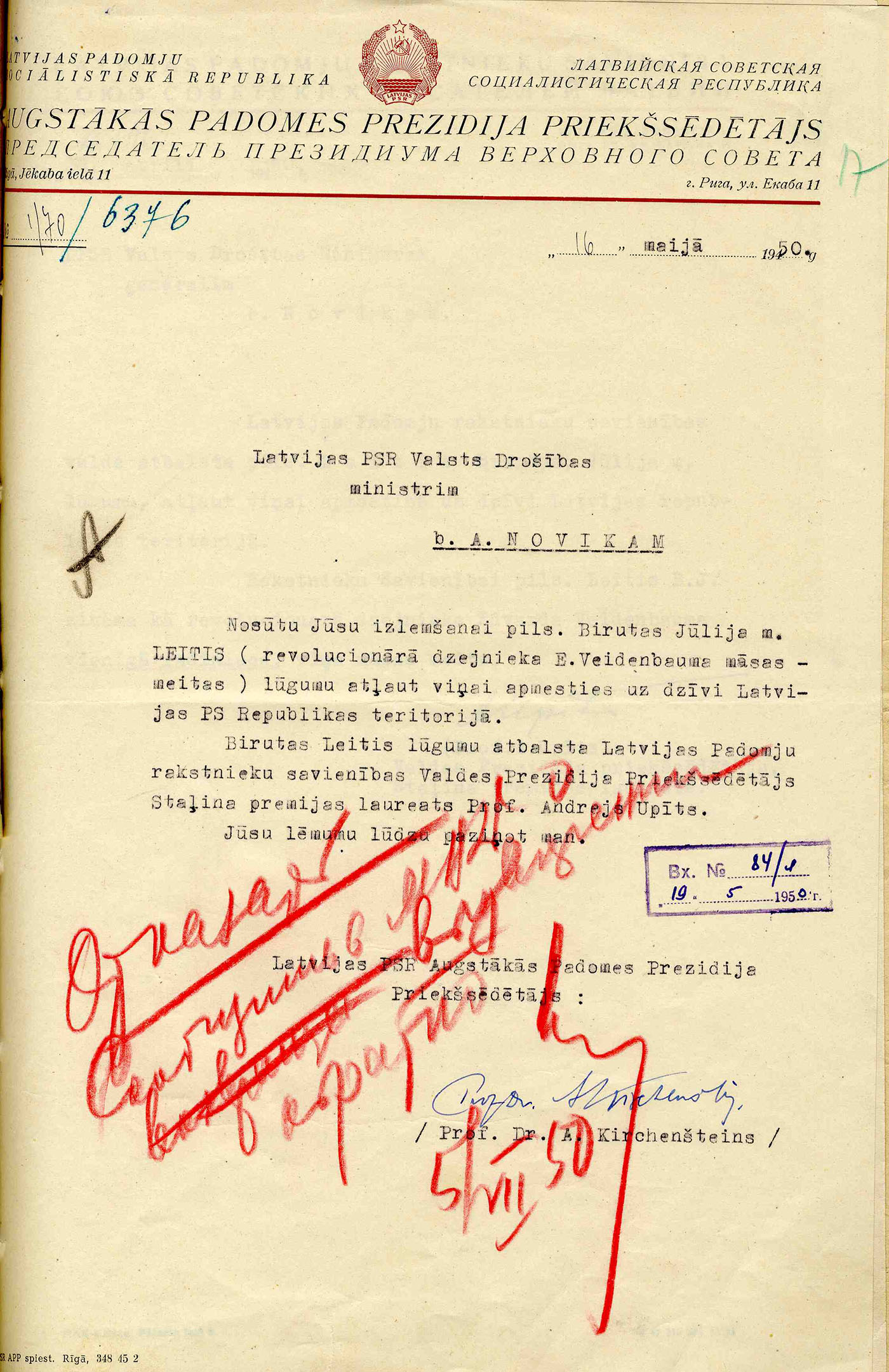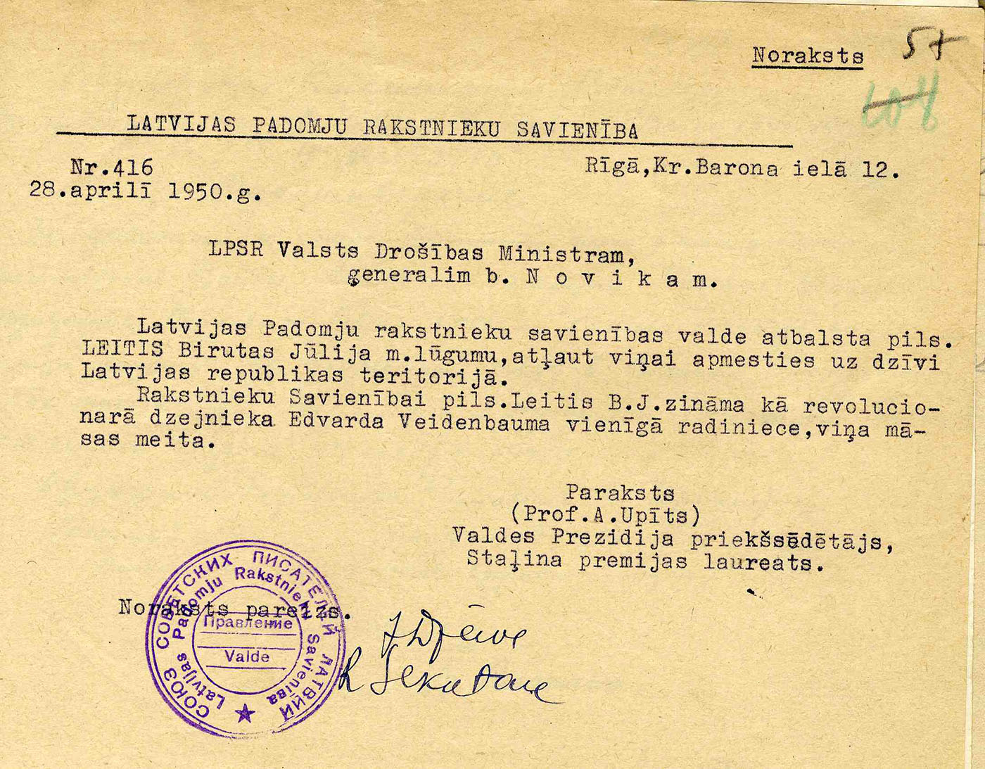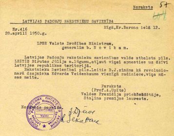 Kārļa Egles uzaicinājumam sekojot, aizbraucu uz Rīgu. K. Egle bija ļoti priecīgs, laipni mani uzņēma, parunājāmies kādu brīdi un tad gājām pie Andreja Upīša. Arī A. Upītis bija ļoti laipns, iztaujāja, kā man Sibīrijas ceļos gājis. Jautāja, vai es jau kaut kur esot pierakstījusies. Teicu, ka Cēsīs mani negrib pierakstīt. Tad A. Upītis uzrakstīja man tādu rakstu, lai mani pieraksta Cēsīs. Tikām runājuši par izsūtīšanu. Andrejs Upītis teica, ka tā esot bijusi liela neapdomība... Ja vajadzējis ko izsūtīt, tad tikai īsti vainīgos, bet tas jau tā esot, ka tajos brīžos, tādā ekstāzē ne viens vien nodara daudz ļauna. Viņa izteiciens bija: „Laikmetu griežos ne viens vien vērtīgs grauds tiek samalts pārvērtību laika dzirnakmeņos”.