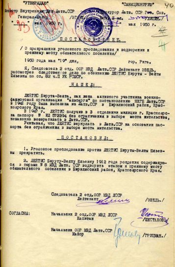 Toreiz, kad griezos pie Zušmaņa izpildu komitejā, viņš deva piekrišanu pierakstīties Cēsīs, ar drebošu roku parakstīdams šo atļauju. Un pie tam vēl piedāvāja palīdzēt iekārtoties darbā. Šo palīdzību man nebija jāizmanto, ar to es pati tiku galā. Braucu pie paziņām laukos strādāt un 1949. gada 15. jūlijā tiku pieņemta pat Cēsu patērētāju biedrības veikalā Nr. 31. kur nostrādāju ar atzinībām līdz 1950. gada 26. aprīlim, kad mani arestēja /no veikala/, jo es esot patvarīgi izbēgusi no izsūtīšanas Sibīrijā. Bet tas ir atkal cits stāstījums. Kur piecus gadus, bez vainas vainīgā, pavadīju smagā darbā un kur man arī piedzima dēliņš Jānis /16.01.51/. Un tikai 1955. gada janvārī varēju atgriezties mājās.