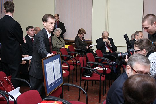 LVA darbinieks Ritvars Jansons prezentē ASV dāvinājumu Stenfordas universitātes Hūvera institūta dokumentu kopijas, kuras nonāks arhīva fondos.