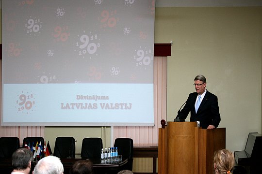 uzrunā starptautiskās konferences Latvijas valsts neatkarība: ideja un realizācija dalībniekus Kara muzejā 13. novembrī.