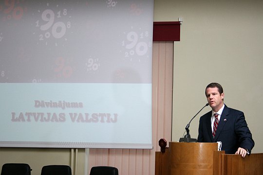 ASV vēstnieks Latvijā Čārlzs Larsons uzrunā starptautiskās konferences Latvijas valsts neatkarība: ideja un realizācija dalībniekus Kara muzejā 13. novembrī.