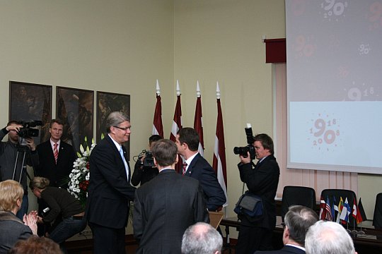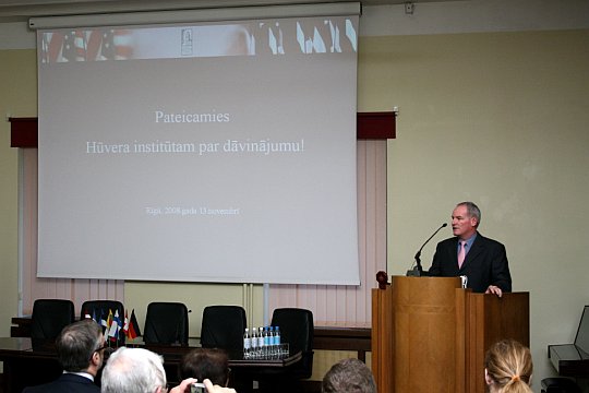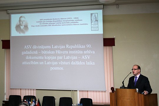 Starptautiskās konferences Latvijas valsts neatkarība: ideja un realizācija laikā 13. novembrī Kara muzejā Latvijas valsts saņēma ASV dāvinājumu Stenfordas universitātes Hūvera institūta dokumentu kopijas par ASV Latvijas attiecībām un Latvijas vēsturi dažādos laika posmos. Dāvinājums tika nodots Valsts prezidentam Valdim Zatleram un nonāks LVA fondos. Attēlā skats pirms konferences sākuma.