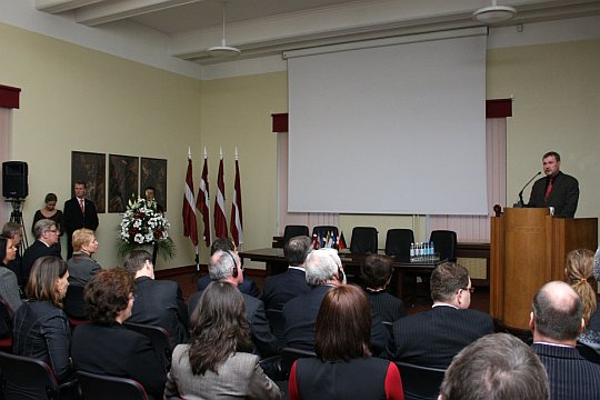 Latvijas Republikas Valsts prezidents Valdis Zatlers uzrunā starptautiskās konferences Latvijas valsts neatkarība: ideja un realizācija dalībniekus Kara muzejā 13. novembrī.