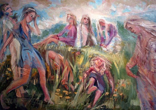 Neoimpresionisma stilā ar gaismas spēli un figūru interpretāciju. Vides un iespaidu tēlojums.