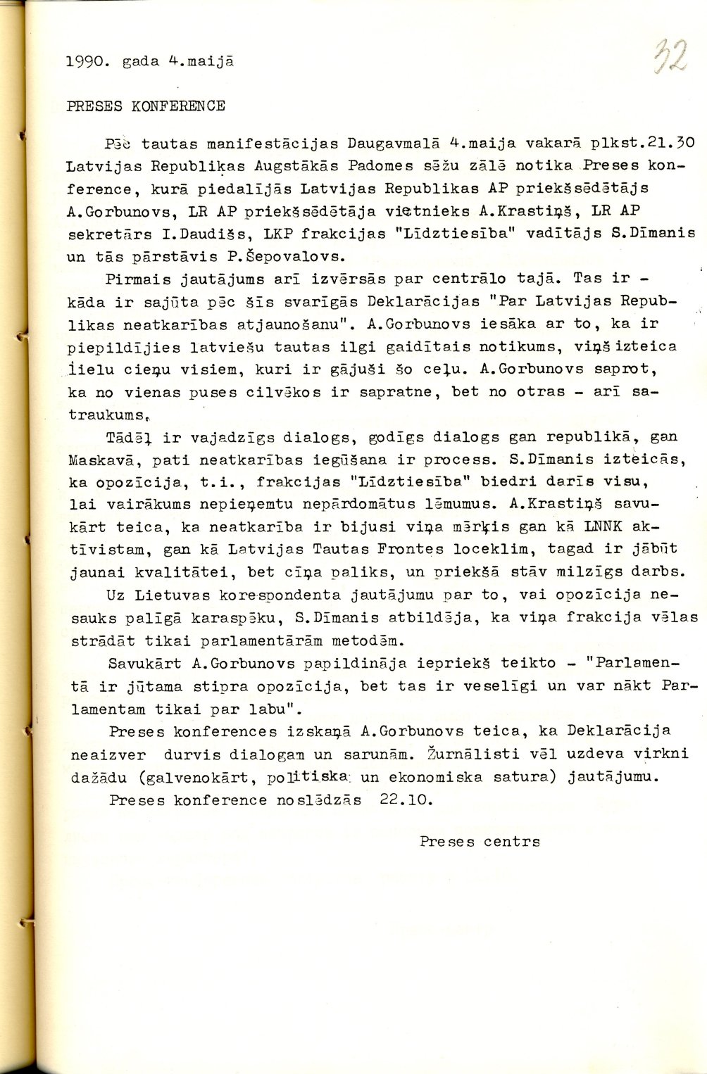Latvijas Republikas Augstākās Padomes Preses centra ziņojums 1990. gada 4. maijā par preses konferenci pēc tautas manifestācijas Daugavmalā.