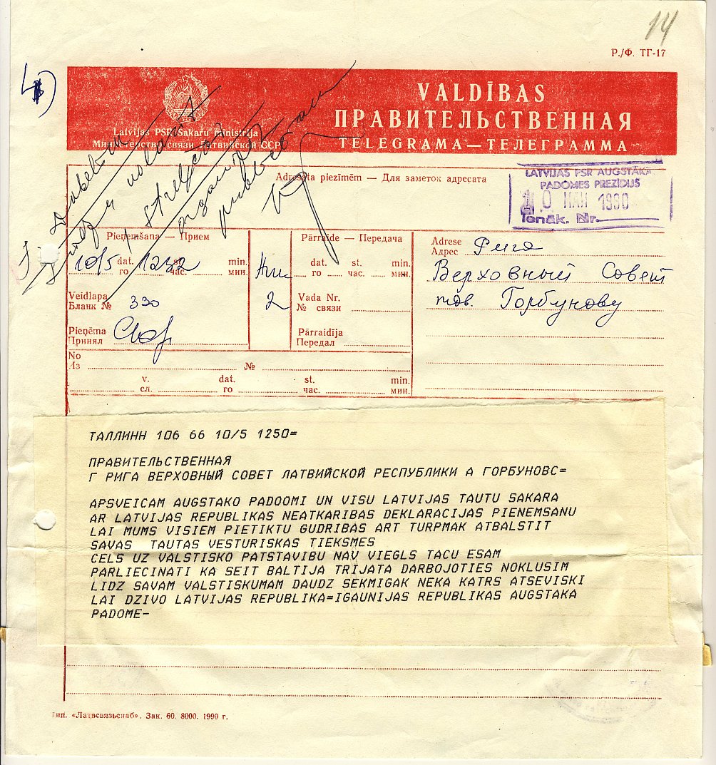 Igaunijas Republikas Augstākās Padomes apsveikuma telegramma Latvijas Republikas Augstākajai Padomei sakarā ar Neatkarības deklarācijas pieņemšanu. 1990. gada 5. maijs.