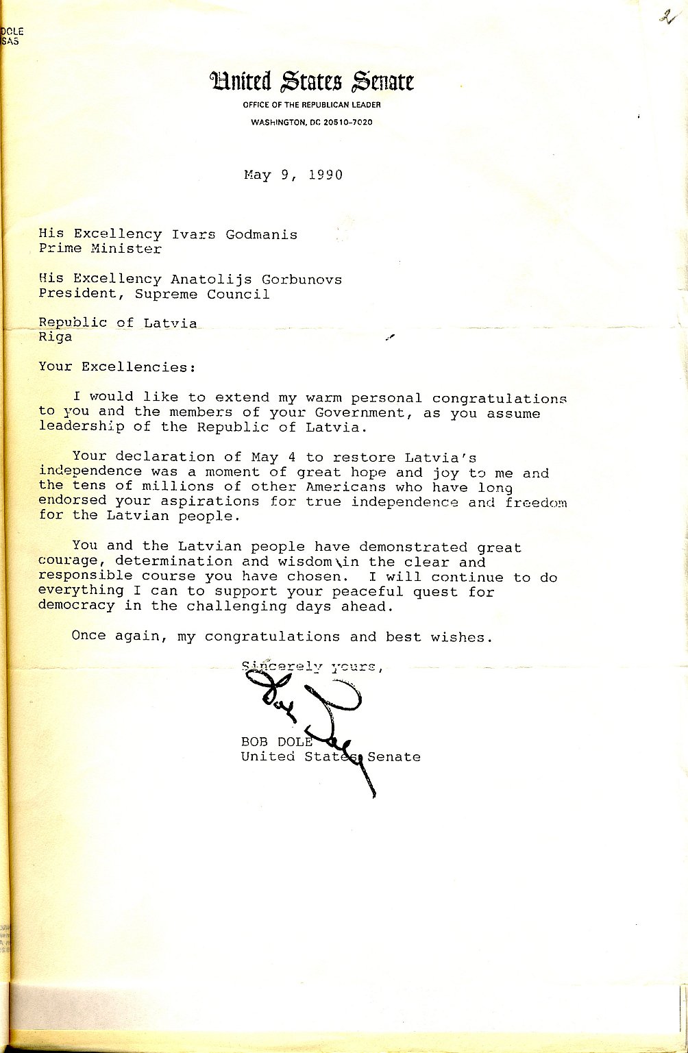 ASV senatora, Republikāņu līdera Senātā Roberta Doula apsveikums LR Ministru Padomes priekšsēdētājam Ivaram Godmanim un LR Augstākās Padomes priekšsēdētājam Anatolijam Gorbunovam uzsākot pildīt amata pienākumus un sakarā ar 4. maija deklarāciju. 1990. gada 9. maijs.