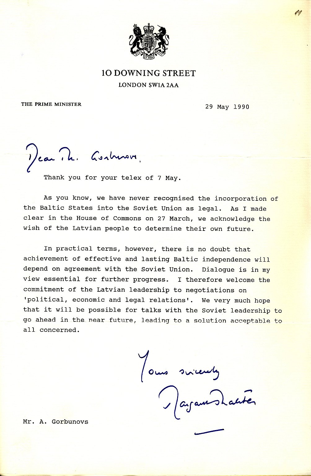 Mārgareta Tečere uzsver, ka Lielbritānija nekad nav atzinusi Baltijas valstu inkorporāciju Padomju Savienībā, tomēr Baltijas neatkarība būs atkarīga no līguma ar Padomju Savienību. Tādēļ viņa apsveic Latvijas vadības gribu iesaistīties sarunās par politiskām, ekonomiskām un juridiskām attiecībām. 1990. gada 29. maijs.