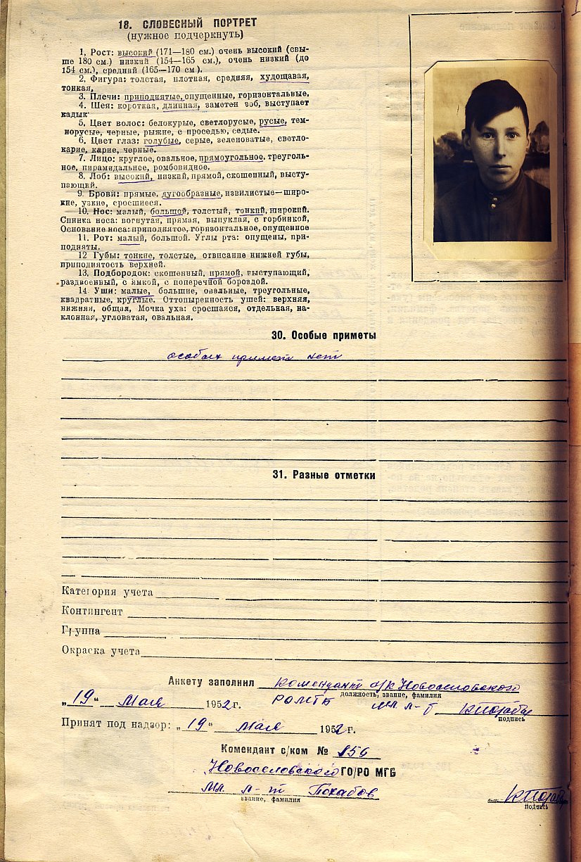 Pūķa Jāņa fotogrāfija un vārdiskais apraksts no specnometinātā anketas. |