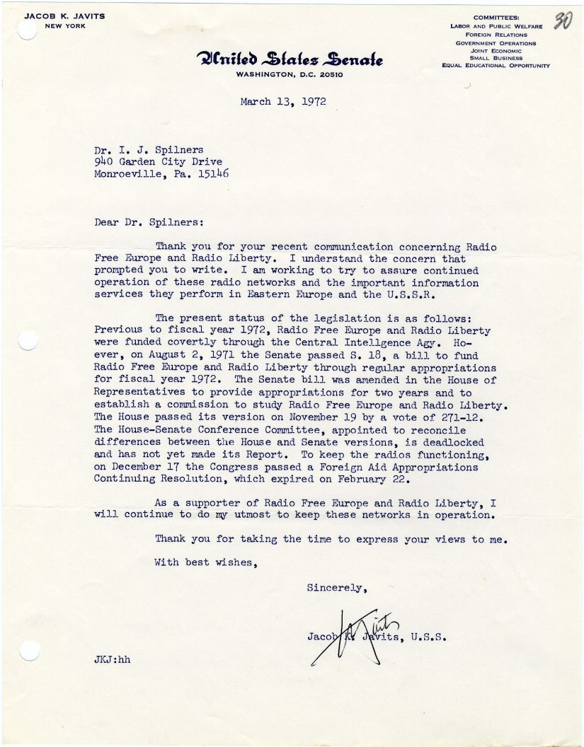 ASV senatora Jacob K. Javits atbildes vēstule Amerikas latviešu apvienības valdes priekšsēdim Ilgvaram Spilneram par ASV Senāta centieniem nodrošināt Radio Brīvā Eiropa/Radio Brīvība darbību Austrumeiropā un PSRS. 1972. gada 13. marts.