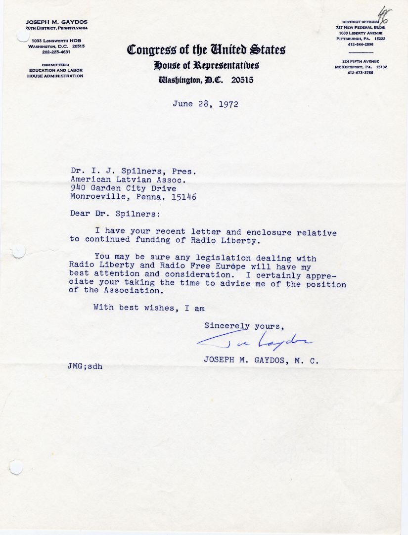 ASV senatora Joseph M. Gaydos vēstule Amerikas latviešu apvienības valdes priekšsēdim Ilgvaram Spilneram par atbalstu visiem tiesību aktiem ASV Senātā Radio Brīvā Eiropa/Radio Brīvība darbības nodrošināšanai. 1972. gada 28. jūnijs.