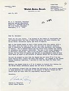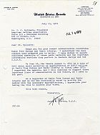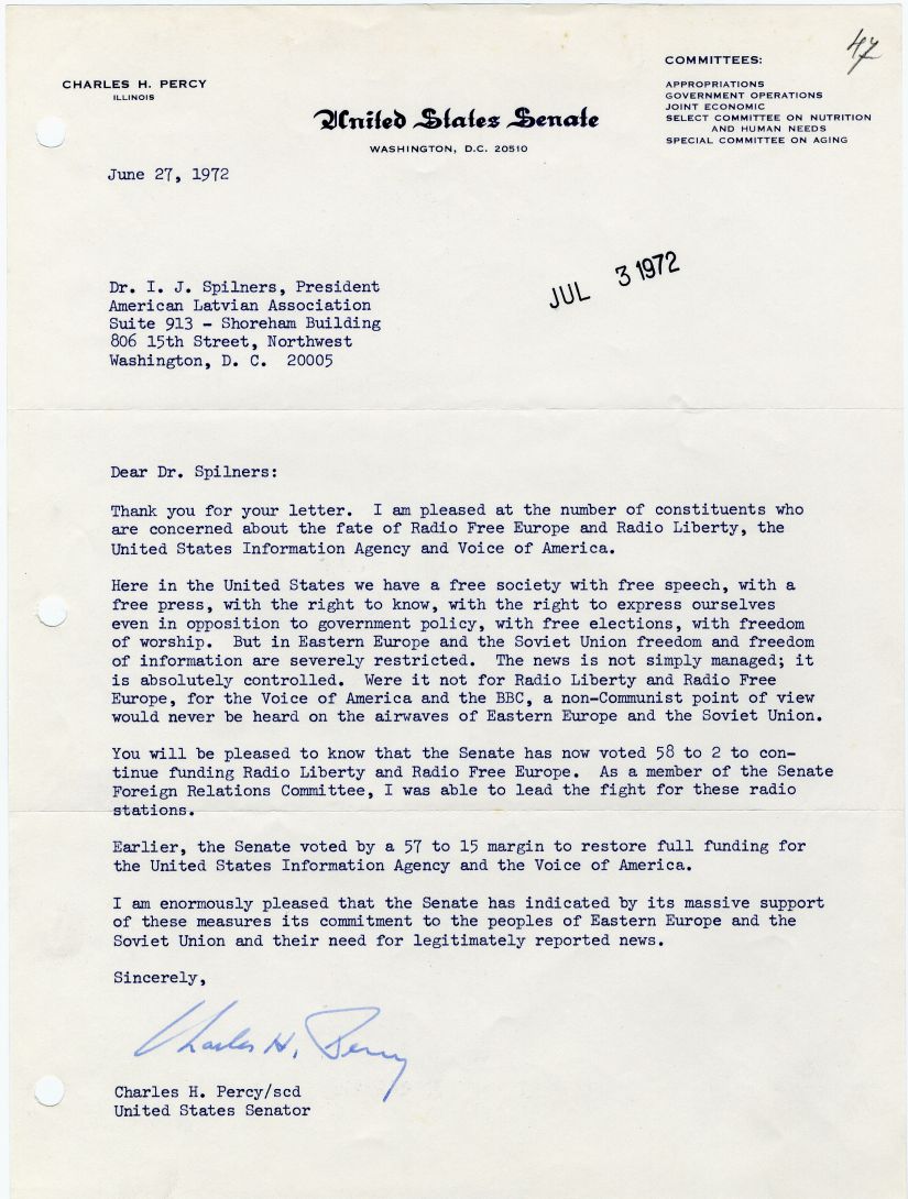 ASV senatora Charles H. Percy vēstule Amerikas latviešu apvienības valdes priekšsēdim Ilgvaram Spilneram par ASV Senāta balsojumu – ar 58 "par" un 2 "pret" – par Radio Brīvā Eiropa/Radio Brīvība finansēšanas turpināšanu. 1972. gada 3. jūlijs.