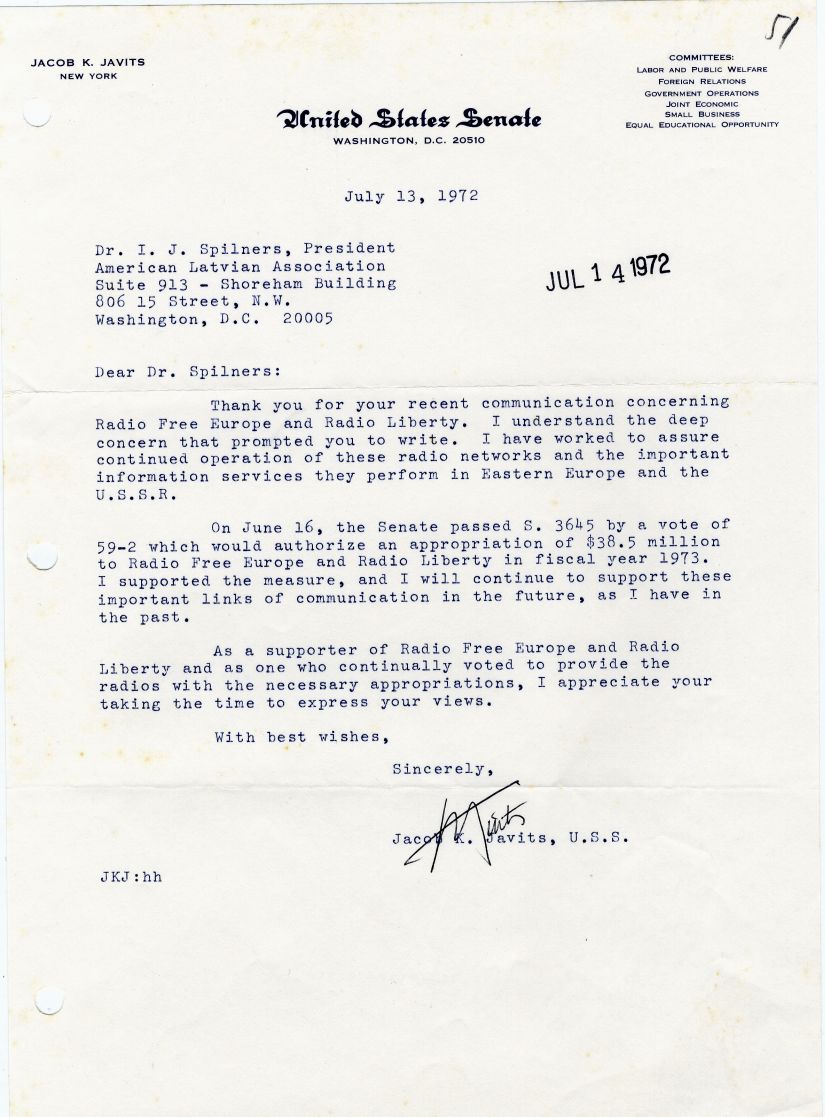 ASV senatora Jacob K. Javits informācija Amerikas latviešu apvienības valdes priekšsēdim Ilgvaram Spilneram par ASV Senāta balsojumu – ar 59 "par" un 2 "pret" – apstiprinot 38, 5 milj. dolāru asignējumu Radio Brīvā Eiropa/Radio Brīvība un turpmāko atbalstu Amerikas latviešu apvienībai. 1972. gada 14. jūlijs.