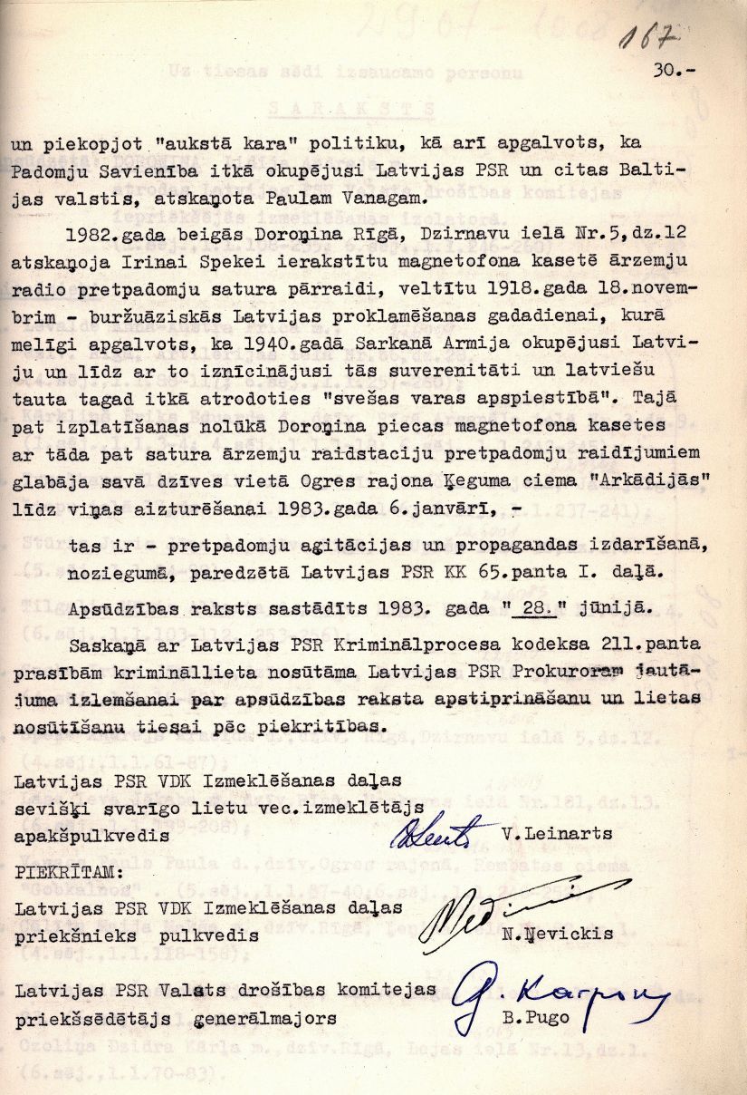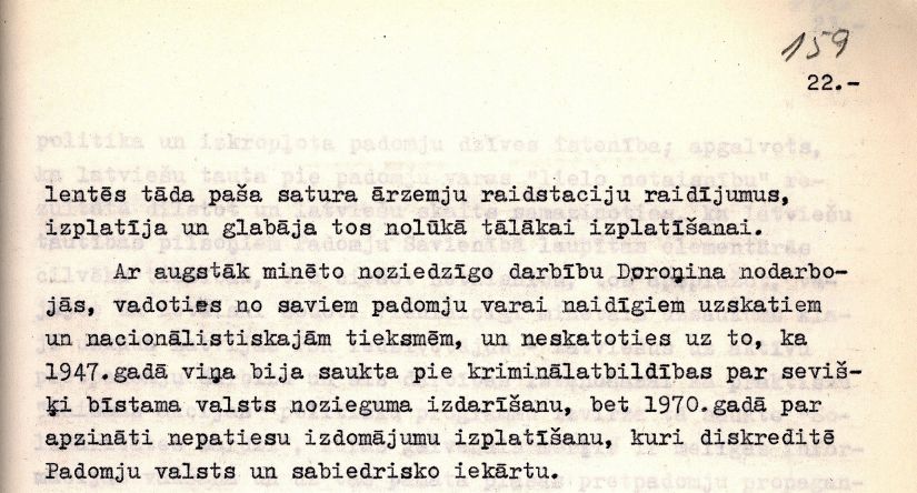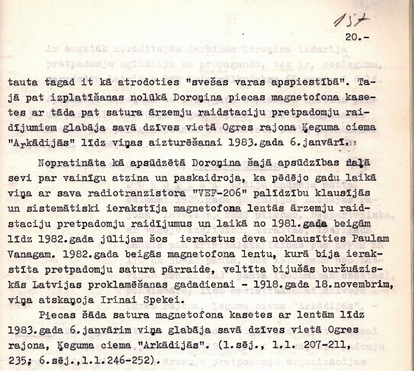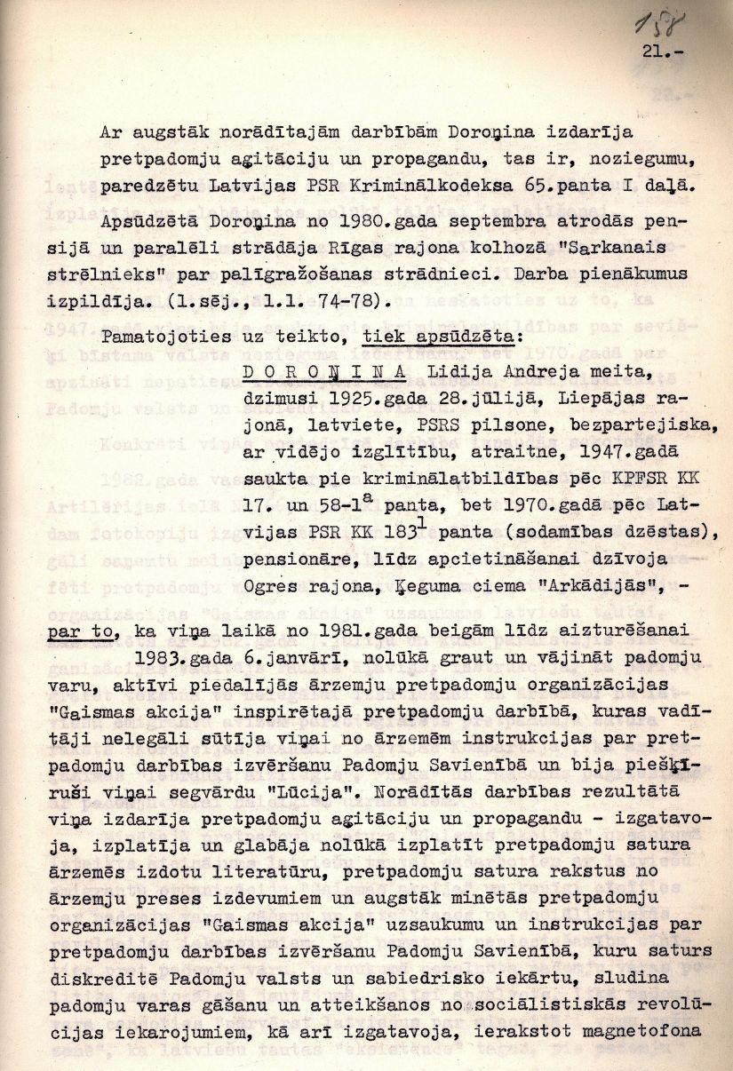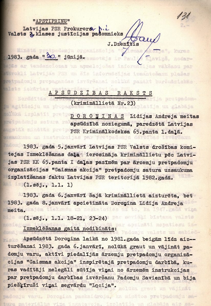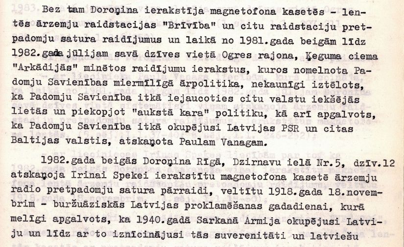 Izvilkumi no Lidijas Doroņinas-Lasmanes apsūdzības raksta, kura apsūdzēta un tiesāta par dalību ārzemju pretpadomju organizācijā "Gaismas akcija", kā arī par ārzemju raidstaciju raidījumu ierakstīšanu magnetafona kasetēs, glabāšanu tālākai izplatīšanai un izplatīšanu. 1983. gada 30. jūnijs.