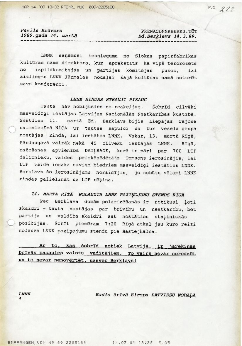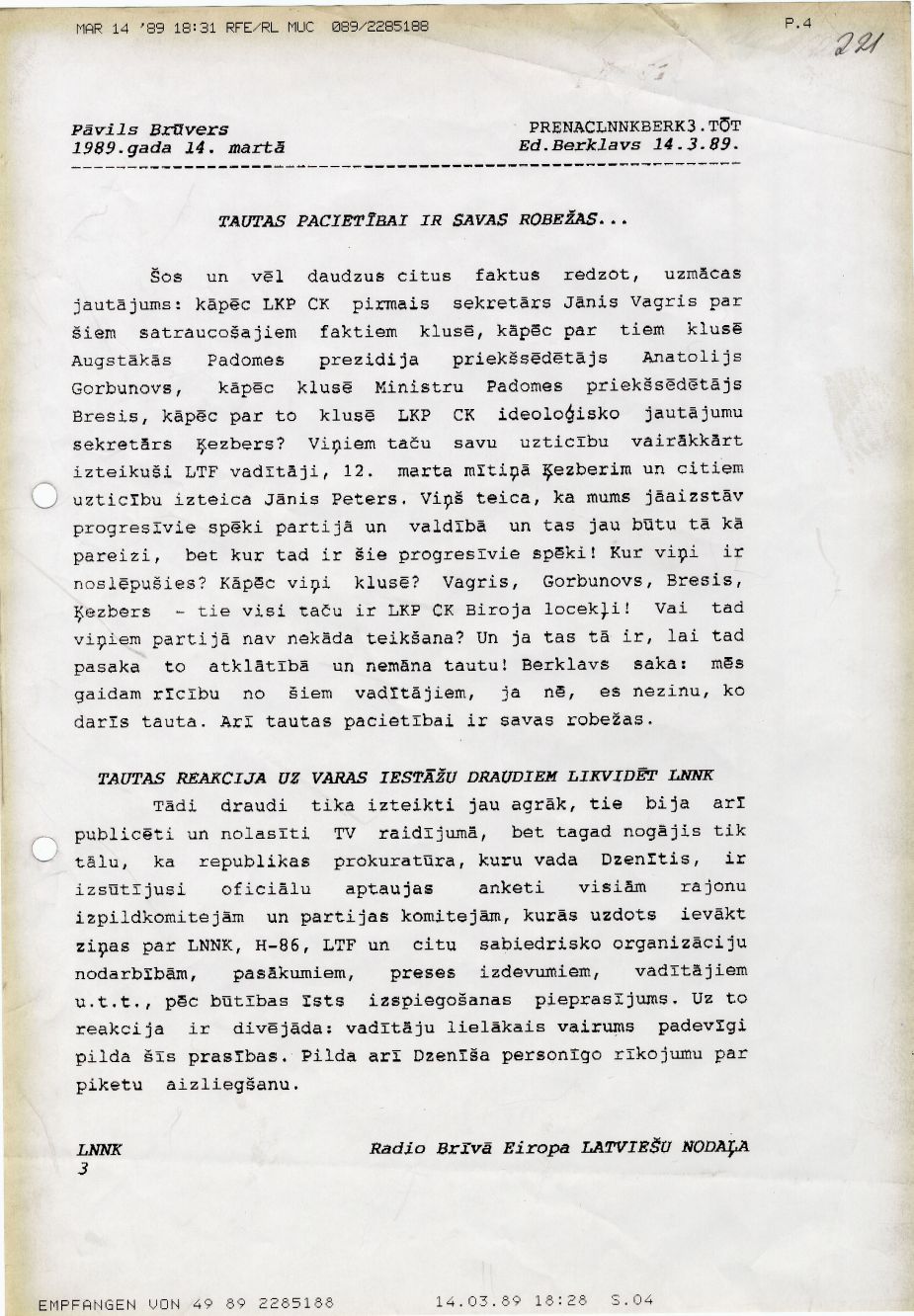 Radio Brīvā Eiropa/Radio Brīvība korespondenta Latvijā Pāvila Brūvera ziņojums Radio Brīvā Eiropa/ Radio Brīvība. 1989. gada 14. marts.