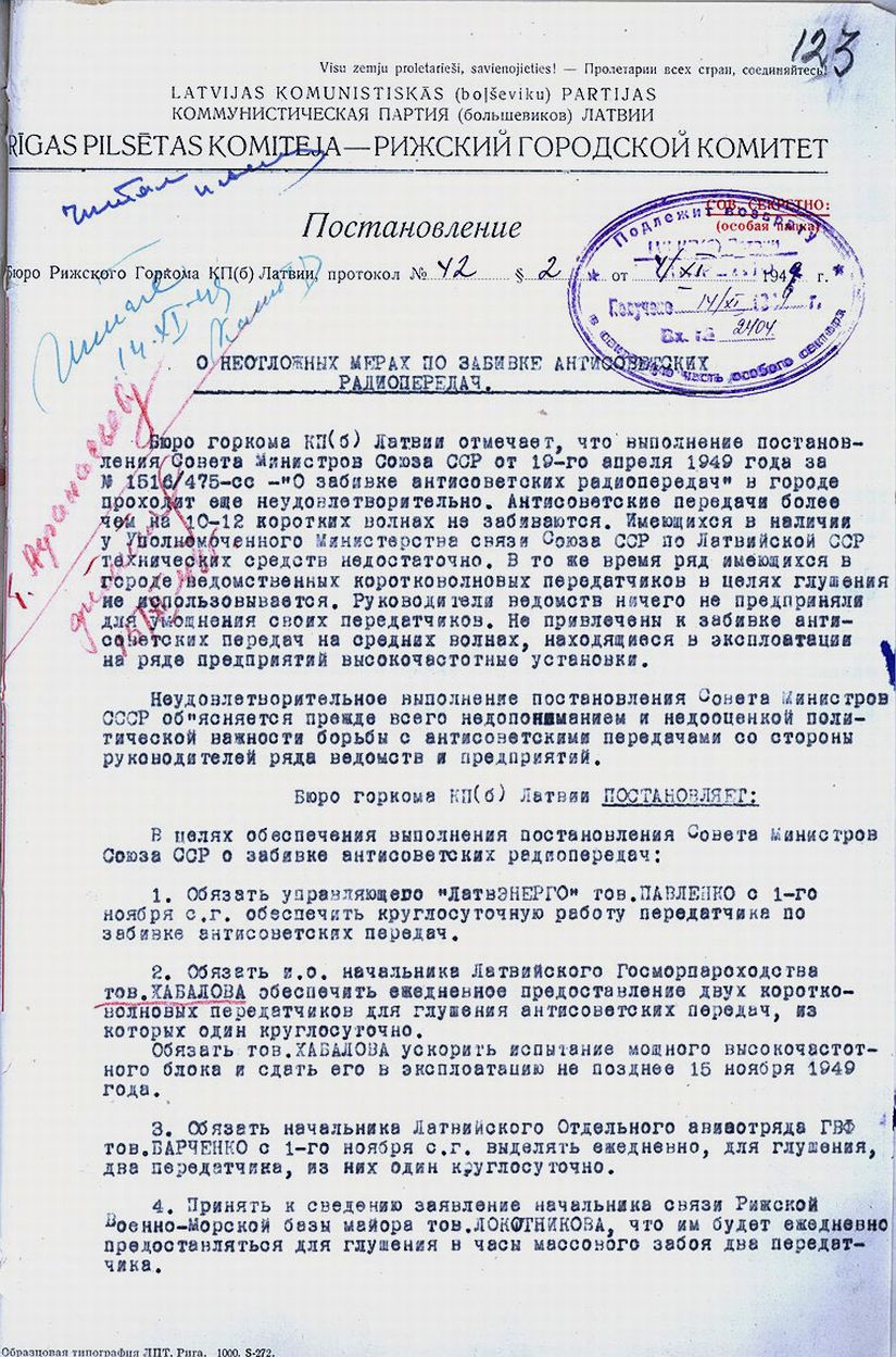 Latvijas K(b)P Rīgas pilsētas komitejas birojs atzīmēja, ka PSRS Ministru padomes 1949. gada 19. aprīļa lēmuma Nr. 1516/465-ps "Par pretpadomju radioraidījumu slāpēšanu" izpilde pilsētā vēl notiek neapmierinoši, jo pretpadomju pārraides vairāk kā 10-12 īsviļņos netiek traucētas, PSRS Sakaru ministrijas pilnvarotā Latvijas PSR rīcībā esošie tehniskie līdzekļi ir nepietiekoši, pretpadomju raidījumu slāpēšanā vidējos viļņos nav iesaistītas uzņēmumos ekspluatācijā esošās augstfrekvences iekārtas.
