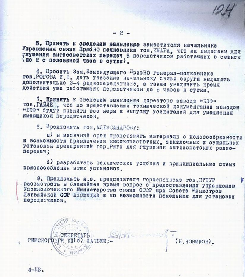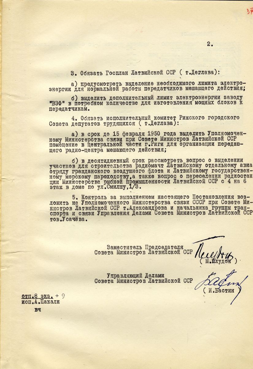 Lai pastiprinātu pretpadomju radiopārraižu traucēšanu Latvijas PSR teritorijā, Latvijas PSR Ministru padome saskaņā ar PSRS MP 1949. gada 30. decembra lēmumu Nr. 5918-2221-ps nolemj uzdot Baltijas kara apgabala Sakaru pārvaldei, Latvijas Valsts jūras kuģniecībai, Transporta pārvaldei mazo upju apgūšanā pie Latvijas PSR MP, "Balttehflot" Latvijas rajonam, Latvijas atsevišķās aviācijas vienībai, "Latvenergo", Latvijas PSR Zivrūpniecības ministrijai, PSRS Sakaru ministrijas pilnvarotajam pie Latvijas PSR MP piecu dienu laikā noslēgt līgumus ar rūpnīcu "VEF" par augstfrekvences pastiprinātāju izgatavošanu, mēneša laikā veikt montāžas un uzstādīšanas darbus; Transporta pārvaldei mazo upju apgūšanā pie Latvijas PSR MP apmaksāt rūpnīcai "VEF" pastiprinātāju izgatavošanu uz Pārvaldes necentralizēto kapitālo ieguldījumu rēķina; Latvijas PSR Valsts plānam paredzēt izdalīt nepieciešamos elektroenerģijas limitus traucējošo raidītāju normālai darbībai., kā arī izdalīt papildus elektroenerģijas limitus rūpnīcai "VEF"; Rīgas pilsētas Izpildkomitejai līdz 1950. gada 15. februārim PSRS Sakaru ministrijas pilnvarotajam pie Latvijas PSR MP Rīgas pilsētas centrā iedalīt telpas traucējošas darbības raidstacijas radio centra organizēšanai.