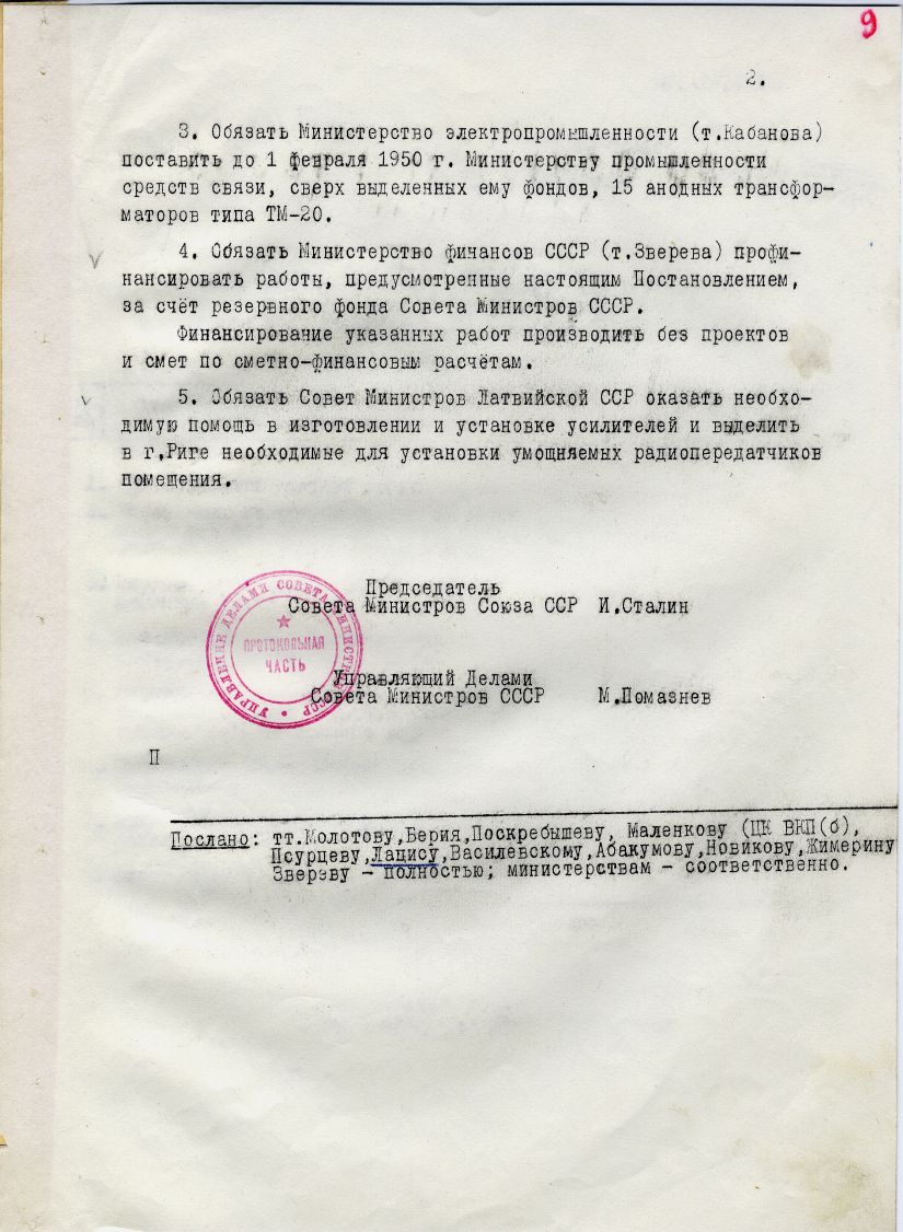 PSRS Ministru padomes sevišķi slepenais lēmums Nr.5918-2221-ps "Par pasākumiem Rīgā esošo radioraidītāju jaudas palielināšanā un izmantošanā pretpadomju radiopārraižu traucēšanā". 1949. gada 30. decembris.