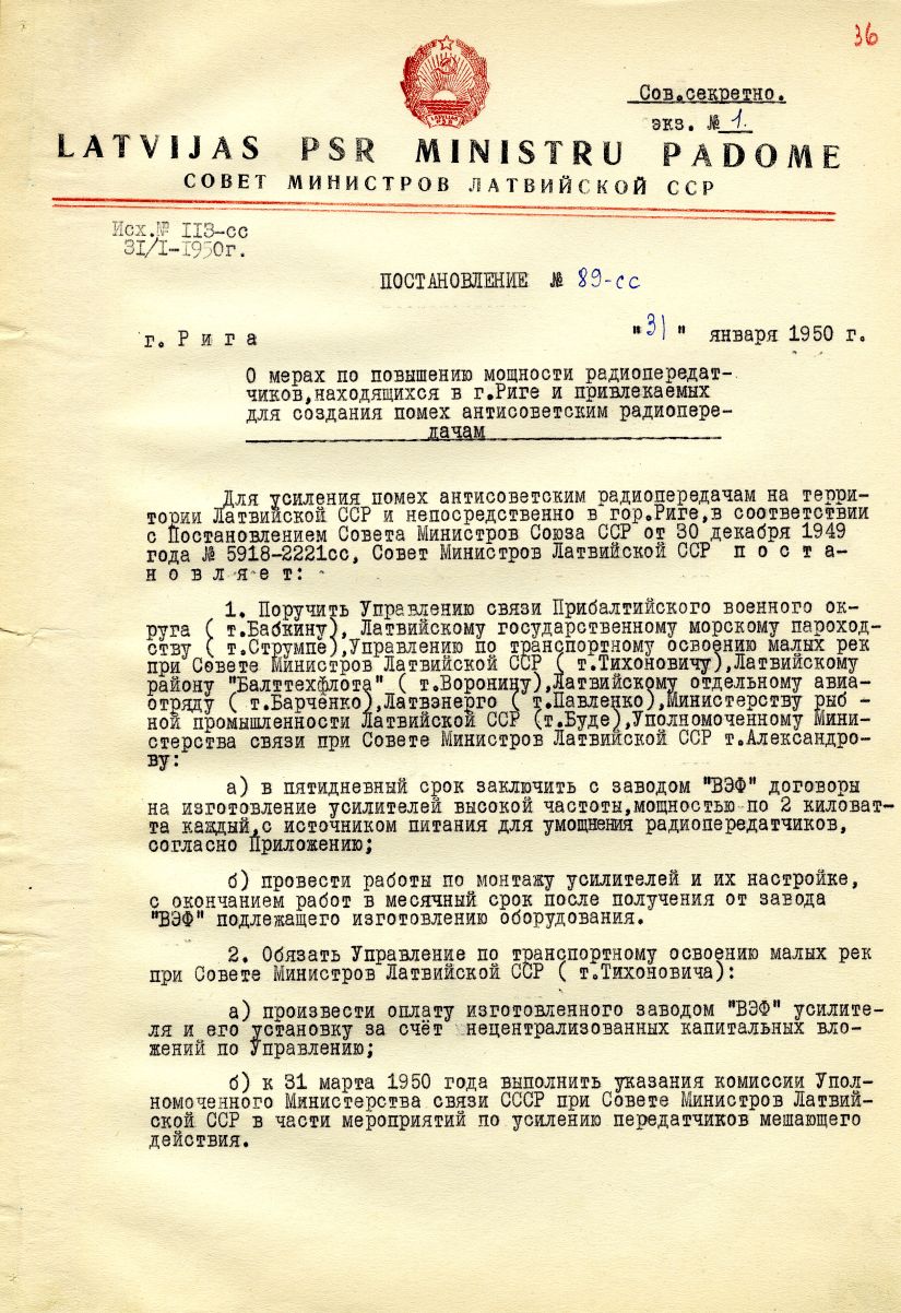 Latvijas PSR Ministru padomes sevišķi slepenais lēmums Nr.89-ps "Par pasākumiem Rīgā esošo radioraidītāju jaudas palielināšanā un izmantošanā pretpadomju radiopārraižu traucēšanā". 1950. gada 31. janvāris.