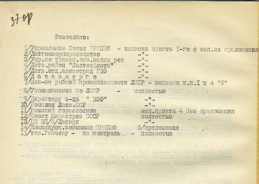 Birojs nolēma, ka Rīgas pilsētas Izpildkomitejai jāizskata jautājums par platību un telpu ierādīšanu PSRS Sakaru ministrijas pilnvarotajam Latvijas PSR Ministru padomē raidītāju uzstādīšanai.
