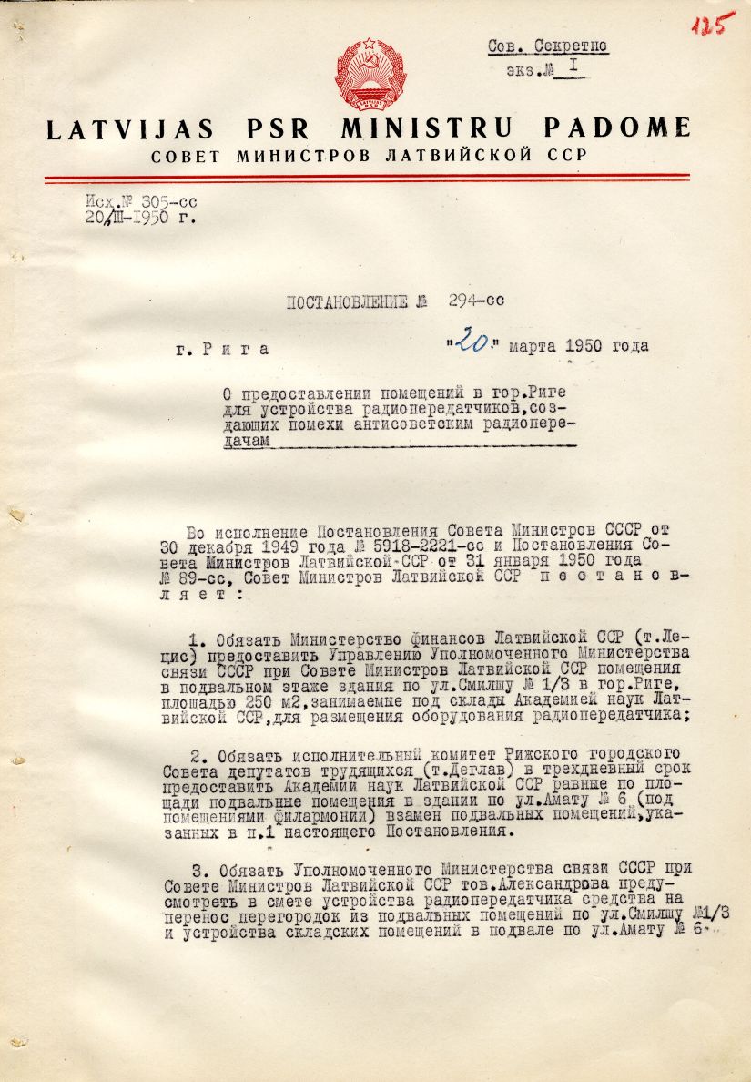 Latvijas PSR Ministru padomes sevišķi slepenais lēmums Nr. 294-ps 'Par telpu ierādīšanu Rīgas pilsētā pretpadomju radioraidījumu traucējošu radioraidītāju ierīkošanai". 1950. gada 20. marts.