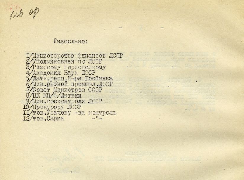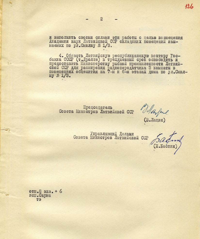 Uzlikt par pienākumu PSRS Valsts bankas Latvijas republikāniskajam kantorim trīsdienu laikā atbrīvot un ierādīt telpas - trīs istabas Smilšu ielas 1/3 nama 6. un 7. stāvā - Latvijas PSR Zivrūpniecības ministrijai radioraidītāja paplašināšanai.