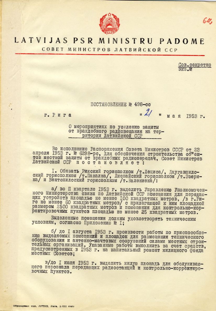 Latvijas PSR Ministru padomes sevišķi slepenais lēmums Nr. 498-ps "Par pasākumiem aizsardzības pastiprināšanai pret naidīgiem radioraidījumiem Latvijas PSR teritorijā". 1953. gada 21. maijs.