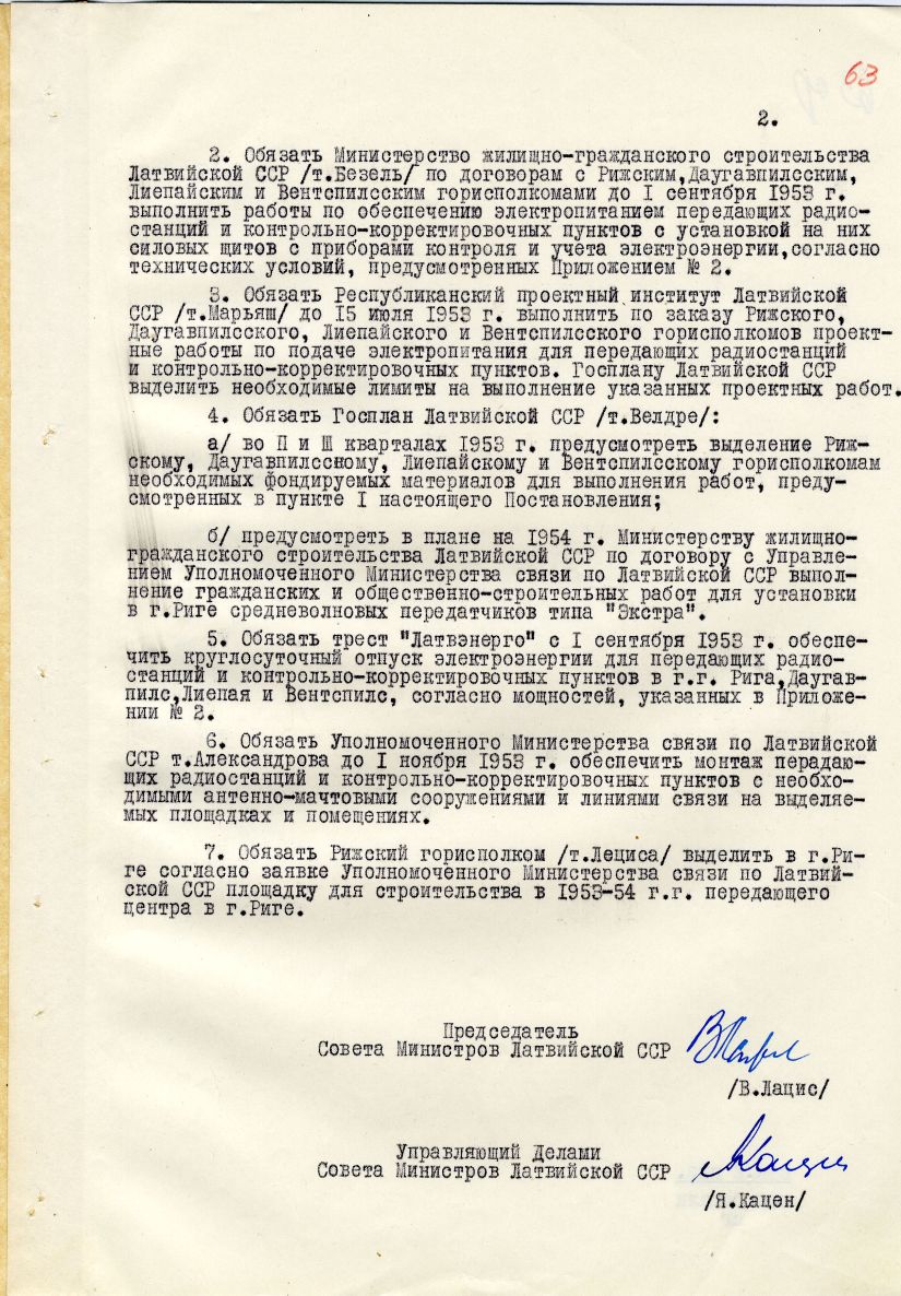 Izpildot PSRS Ministru padomes 1953. gada 23. aprīļa rīkojumu Nr. 6298-rs, kas paredzēja vietējo celtniecības objektu nodrošināšanu aizsardzībai pret naidīgajām radiopārraidēm, Latvijas PSR Ministru padome nolēma – uzlikt par pienākumu Rīgas pilsētas izpildkomitejai, Daugavpils, Liepājas un Ventspils pilsētas izpildkomitejām iedalīt telpas PSRS Sakaru ministrijas pilnvarotajam pie Latvijas PSR MP radioraidītāju iekārtu uzstādīšanai. Ierādītajām telpām jābūt atbilstošām pielikumā Nr. 1 norādītajiem tehniskajiem nosacījumiem. Līdz 1953. gada 1. augustam telpas un platības jāpielāgo tehnisko iekārtu un masta antenu iekārtu izvietošanai. Savukārt līdz 1953. gada 1. jūlijam jāierāda dzīvojamā platība radiostacijas un koriģēšanas kontrolpunktu personālam.